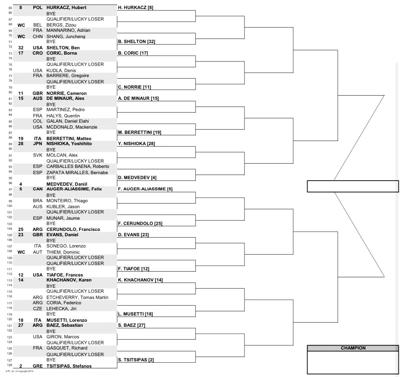 该区的首轮焦点对话是一场法国德比,伤愈复出不久的酷小黑孟菲尔斯迎战前哈雷赛冠军恩贝尔。 四分之三区由刚刚终止十九连胜的梅德维德夫领衔,他首战将迎战西班牙德比的胜者。 该区其他的种子球员还有胡尔卡奇、谢尔顿、丘里奇、诺里、贝雷蒂尼、德米纳尔、胡尔卡奇等。