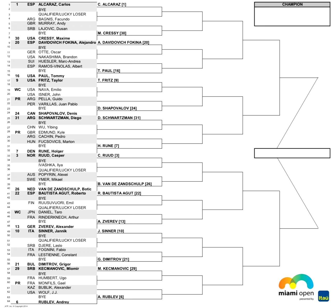 这边厢印第安维尔斯巨匠赛才刚刚终了,本周,阳光双赛中的另外一项大赛迈阿密巨匠赛也将接档而至。今天清晨,赛事的签表也曾经新颖出炉,让我们来先睹为快。 卫冕冠军、新科印第安维尔斯巨匠赛冠军阿尔卡拉斯将作为头号种子出征,享用首轮轮空待遇的他,在次轮的对手可能是阿根廷人巴格尼斯。该区其他种子球员还包含鲁内、弗里茨、保罗、沙波瓦洛夫、克雷西、施瓦泽曼、福基纳等。