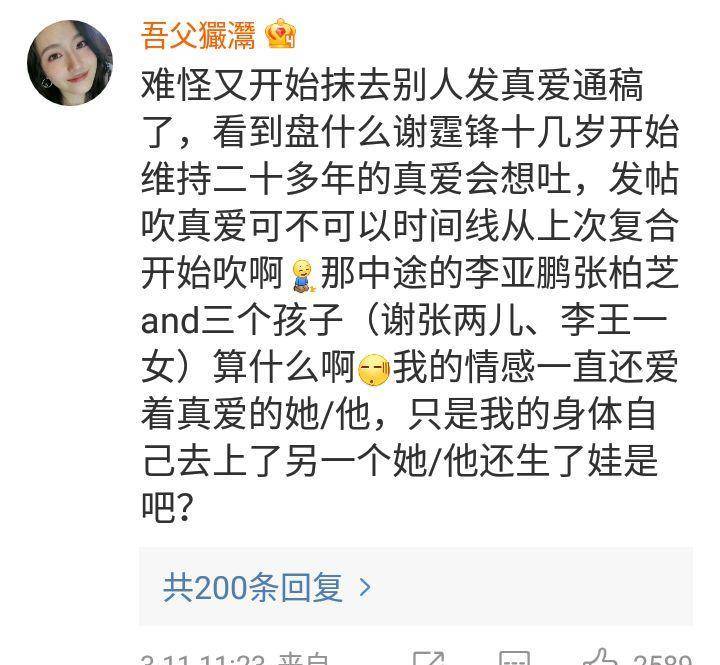 他们很恶感那些网络上的真爱草稿:“什么从谢霆锋十几岁开端,为什么这份真爱持续了20多年,中间又是什么李亚鹏和张柏芝,那些孩子又是什么?” 说实话,网友们的恶感不是没有道理的。王菲不止一次公开表示李亚鹏做作不真实,还直言不想再跟他演戏!谢霆锋在和张柏芝在一同后面对媒体质疑时也表示,自己20多年来最喜欢的人是王菲。