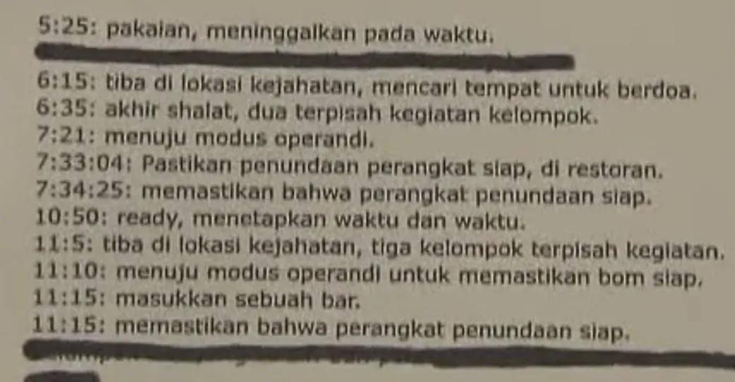 调查人员正在爆炸现场组织调查。 被锉去编号的三菱车底盘,被偷运进岛的管制化学品氯酸钾,发起自杀式攻击的炸弹客,每条线索都很重要,但每条都进了死胡同。 最后期限马上就到。 11月3日,万般无法的帕斯迪卡请求调查组对三菱车底盘重新中止勘验,希望能找到恐惧分子留下的千丝万缕。功夫不负有心人,调查员发现底盘上有一段4厘米长的铁片有异常,用工具揭开之后铁片下方显露一串明晰的数字,恐惧分子锉平了裸露的零件编号,却不知还有一个躲藏的编号,这个编号成为破案的关键。 调查人员立刻对该车7任车主展开调查,最后1任车主名叫阿姆鲁兹。依据当时印尼警方控制的情报,阿姆鲁兹是“伊斯懒宽祷团”的主干成员,且和“基地”组织关系密切,该车车牌属于爪哇岛,而阿姆鲁兹的主要藏匿地点也在爪哇岛,自然成为调查的重点和最大嫌疑人。 五、被审问的恐惧分子 11月5日,印尼警方拘捕了藏匿在爪哇岛的阿姆鲁兹。他被捕时满脸笑容,似乎在为能够殉道而开心,而审问期间还兴高采烈描画自己看到爆炸局面后内心难以抑止的兴奋,丝毫没有悔悟之意。 经过审问,阿姆鲁兹招认谋划并实施了巴厘岛爆炸案,并供出了同伙。 依据供词,警方相继拘捕了35名与爆炸案相关的恐惧分子,包含幕后谋划者萨姆德拉和穆赫拉斯,并在穆赫拉斯的电脑中找到1份长达34页的《巴厘岛工程》谋划文件。 该文件共分5章,对恐惧分子的人员分工、目的选择、道路规划、行动方式、攻击效果、时间节点等均有细致描画,让人毛骨悚然。 其他与案情有关的“伊斯懒宽祷团”主干成员帕特克、阿扎哈里、托普、祖尔卡纳恩等人畏罪潜逃,印尼警方发出通缉令。因受害者中有美国人,帕特克和祖尔卡纳恩被美国“正义赏金”计划分别悬赏100万和500万美圆缉拿。