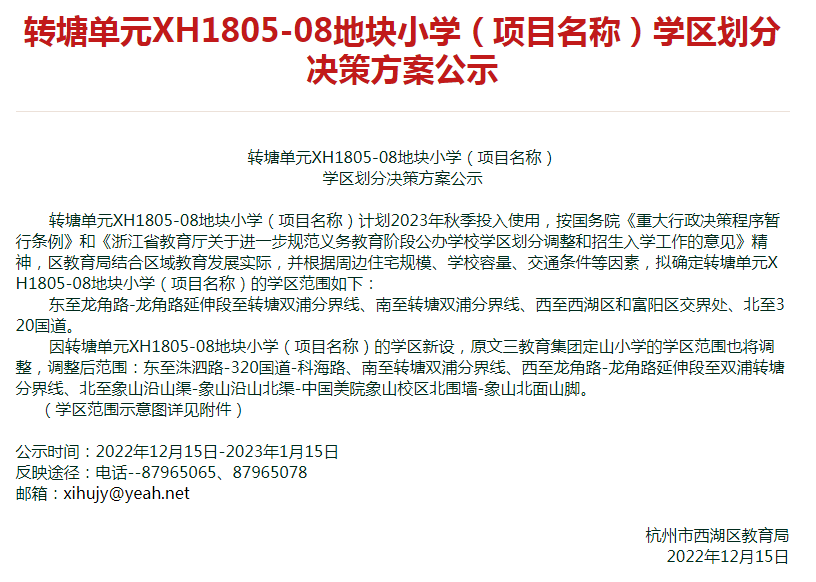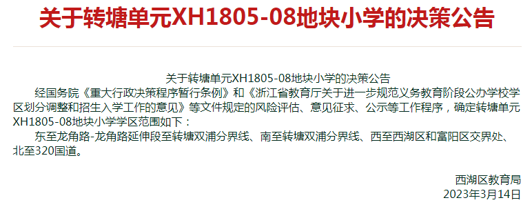 西湖区 近日,西湖区教育局陆续发布了多所学校学区划分计划的征求意见与决策公告。 转塘单元XH1805-08地块小学 学区范围: 东至龙角路-龙角路延伸段至转塘双浦分界线、南至转塘双浦分界线、西至西湖区和富阳区交界处、北至320国道。