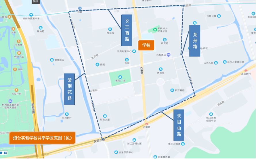 其中,共享杭州市文新小学的学区范围是:东至古墩路,南至天目山路,西至紫荆花路,北至文三西路。此范围内的适龄儿童可选择到炮台实验学校(项目称号)或杭州市文新小学报名入学。 其中,共享杭州市省府路小学的学区范围是:东至竞舟路,南至天目山路,西至古墩路,北至文三西路。此范围内的适龄儿童可选择到炮台实验学校(项目称号)或杭州市省府路小学报名入学。 杭州市文新小学、杭州市省府路小学学区不变(含相应共享范围),学区对应初中不变。