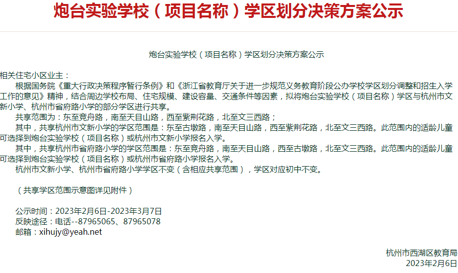 炮台实验学校(项目称号) 2月6日,西湖区教育局就炮台实验学校(项目称号)的学区范围,在西湖区政府门户网站公开征求社会公众意见。 拟将炮台实验学校(项目称号)学区与杭州市文新小学、杭州市省府路小学的部分学区中止共享。 共享范围为: 东至竞舟路,南至天目山路,西至紫荆花路,北至文三西路;