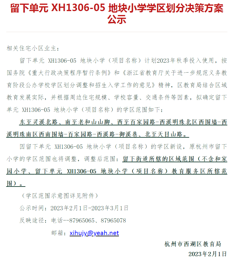 留下单元 XH1306-05 地块小学 2月1日,西湖区教育局就留下单元 XH1306-05 地块小学的学区范围,在西湖区政府门户网站公开征求社会公众意见。拟肯定留下单元 XH1306-05 地块小学(项目称号)的学区范围如下: 东至灵溪北路、南至老和山山脚、西至百家园路-西溪明珠北区西围墙-西溪明珠南区西南围墙-百家园路-西溪路-御溪巷、北至天目山路。