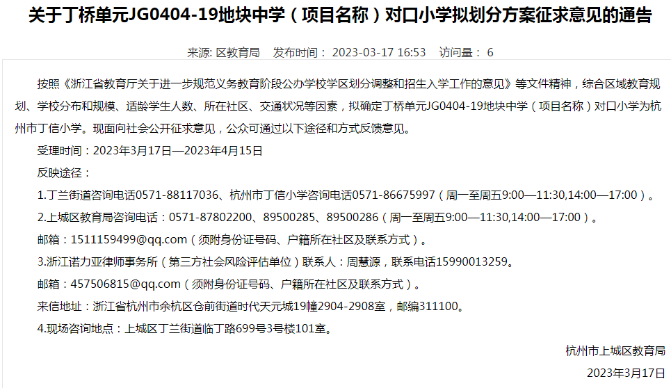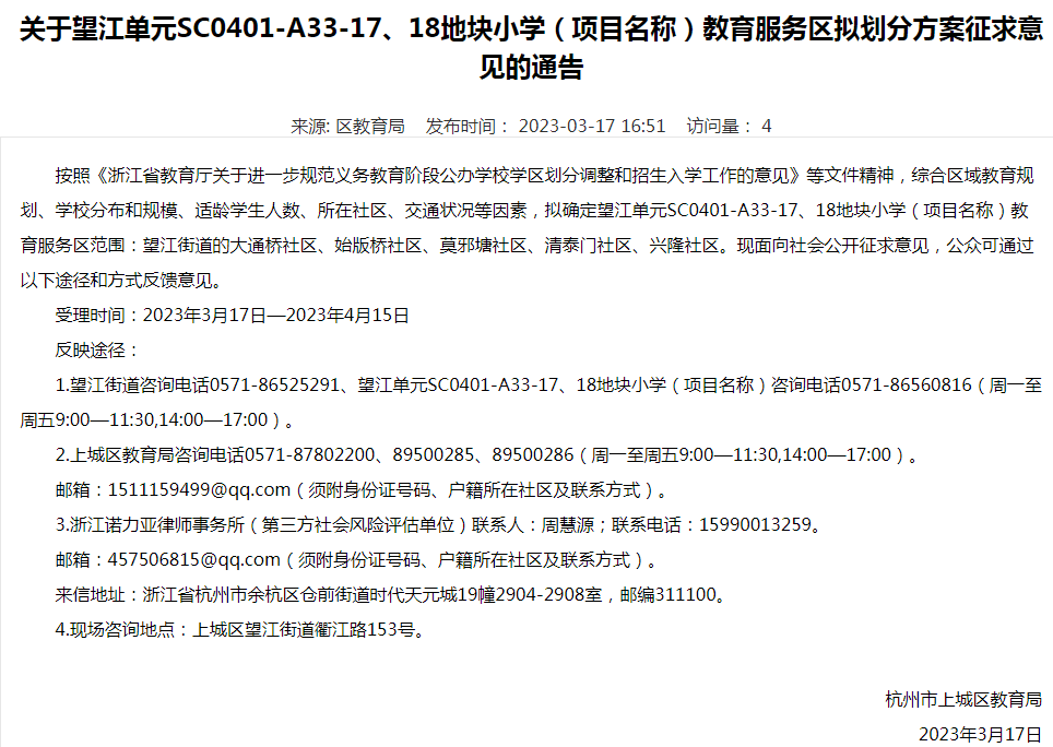 近日, 上城区、西湖区、临平区等 陆续发布 学校学区划分计划的 征求意见与决策公告。 一同来看: 上城区 3月16日,上城区教育局发布关于望江单元SC0401-A33-17、18地块小学(项目称号)教育效劳区,以及丁桥单元JG0404-19地块中学(项目称号)对口小学拟划分计划征求意见的通告。 望江单元SC0401-A33-17、18地块小学(项目称号) 拟肯定望江单元SC0401-A33-17、18地块小学(项目称号)教育效劳区范围: 望江街道的大通桥社区、始版桥社区、莫邪塘社区、清泰门社区、兴隆社区。