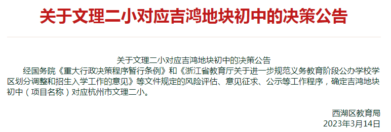 吉鸿地块初中(项目称号) 肯定吉鸿地块初中(项目称号)对应杭州市文理二小。