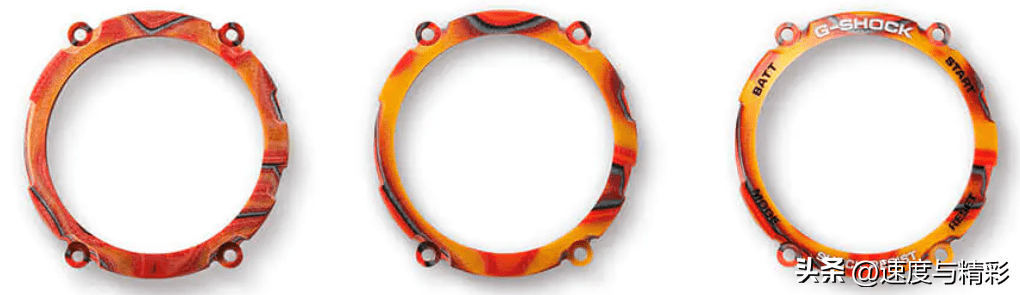 表圈的6点与12点的位置,采用融入夜光资料的环氧树脂与碳纤维的资料,经过高温高压的金属模具成形,然后切削研磨制成。在明亮的环境下显现黑色,在暗光环境下会看到相似日辉的图案。