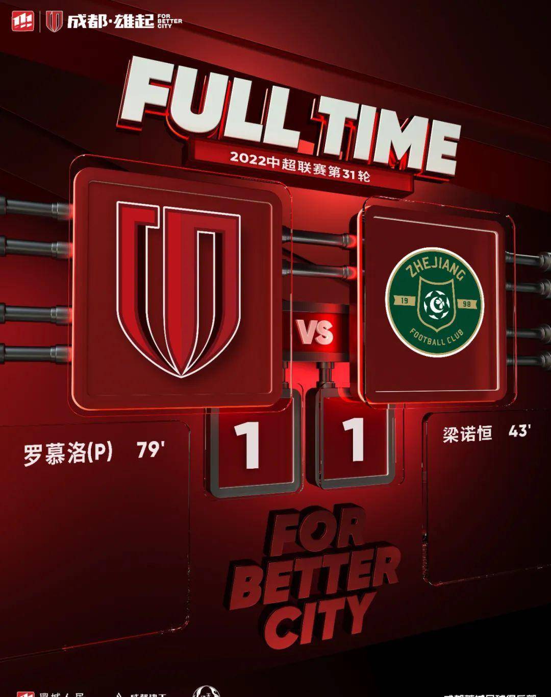 90分钟战罢,成都蓉城在先丢一球的状况下扳平比分,也将联赛连续不败战绩提升至11场。接下来我们将回归主场,迎接足协杯和最后三轮联赛,成都雄起!