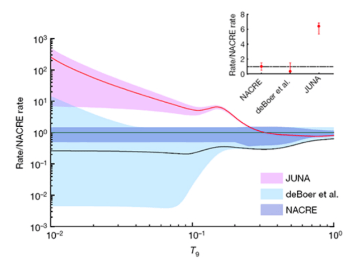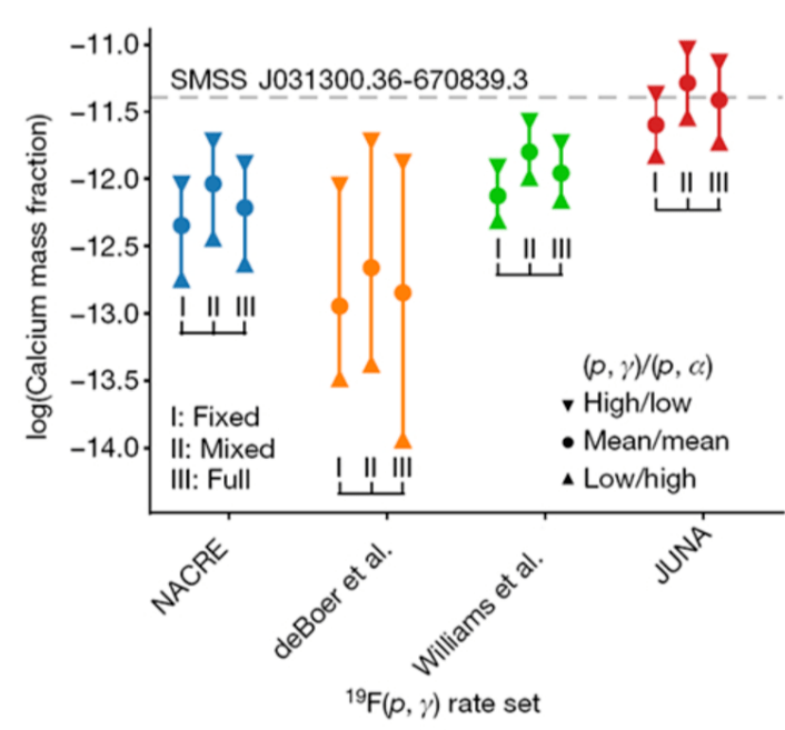 据引见,相比意大利格兰萨索的公开 LUNA 实验室(Laboratory for Underground Nuclear Astrophysics),中国的 JUNA 的宇宙射线通量,比前者低了大约 100 倍,这为极低截面核天体反响直接丈量提供了绝佳的环境。 基于 JUNA 的低本底环境,在锦屏深地实验室里,协作团队运用质子束流轰击高稳定性 19F 靶,经过丈量 g 射线产额,得到了关键天体反响 19F(p,gamma)20Ne 的反响截面。 相较于之前的工作,此次实验的本底更低、流强更强,让其能够向更低能区推进,从而发现了一个位于 225keV 的新共振。 该共振的存在带来了如下益处:它能将 19F(p,gamma)20Ne 反响在 0.1GK 处的反响率进步 7.4 倍。 接着,研讨人员应用天体反响网络模型,重新计算了第一代恒星经过氢熄灭产生的钙元素丰度,结果发现新的 19F(p,gamma)20Ne 反响率,能够重现 SM 0313 的观测数据,从而解释了第一代恒星中钙元素的来源之谜。 另外,本工作还对第一代恒星超新星爆发的模型中止了限制,结果发现其激烈支持弱爆发模型,并扫除了其他可能性。 近日,相关论文以《对 19F(p,gamma)20Ne 反响的丈量表明第一代恒星中存在着碳氮氧循环的突破》(Measurement of 19F(p,gamma)20Ne reaction suggests CNO breakout in first stars)为题发表在 Nature 上。