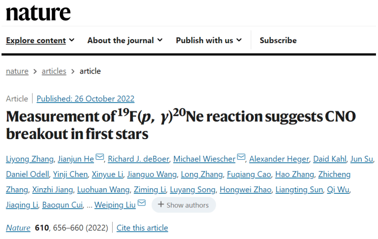 图 | 相关论文(来源:Nature) 北师大核科学与技术学院张立勇副教授是第一作者,何建军教授是第一通讯作者,美国圣母大学核科学实验室迈克尔·维舍尔(Michael Wiescher)教授和南方科技大学物理系教授柳卫平为共同通讯作者。