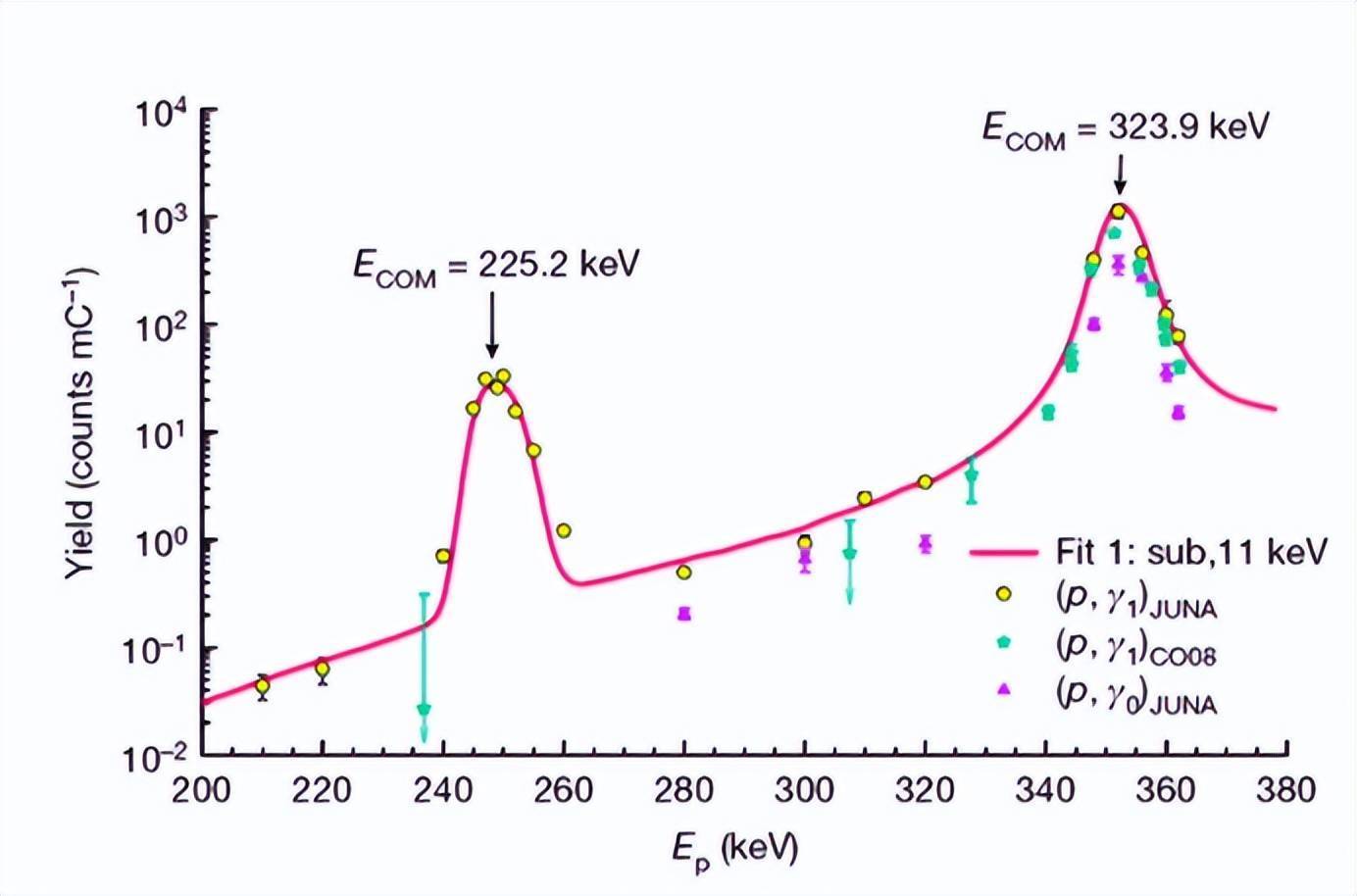 发现位于 225keV 的新共振 核天体物理学最重要的任务,就是研讨上述重元素的核合成过程,主要措施之一就是丈量关键核反响的截面,由此计算最终合成的元素含量,也就是元素丰度。此次北师大分离原子能院、美国圣母大学等团队,所研讨的正是第一代恒星中的核反响。 这也是目前核天体物理的研讨热点,美国和欧洲耗资 100 多亿美圆发射的韦布望远镜的目的之一,在于直接观测第一代恒星的光谱,以研讨其化学成分和演化机制。 如前所述,第一代恒星内部主要是氢和氦,还有少量的碳、氮、氧等元素。此时的恒星主要经过氢熄灭产生能量:氢依次与碳、氮、氧等元素反响,最终变成氦。 而碳、氮、氧等元素的含量基本坚持不变,只是起到催化剂的作用,故被称作碳氮氧循环。 同时,会有十分少量的碳、氮、氧等元素经过与氢的多次反响,产生少量的钙元素。 2013 年,澳大利亚国立天文台发现了一颗迄今为止最古老的恒星 SM 0313。研讨表明,这颗恒星是第一代恒星经过超新星爆发死亡后、所生成的星云重新聚合构成的。 SM 0313 里的一切重元素,都是第一代恒星在其生命周期内合成的。同时,SM 0313 构成后其内部也会中止核合成,但主要是由氢合成氦,简直分歧成重元素。 后来,人们在 SM 0313 中发现了钙元素,证明第一代恒星中的确存在着上述经过碳氮氧循环合成钙元素的过程。 但是,理论计算出的钙元素丰度,却比观测值低 10-100 倍。由此,人们狐疑可能是合成钙元素过程中的关键反响 19F(p,gamma)20Ne 的截面数据、或者反响率有误,招致钙元素丰度计算值偏小。 但是,这一反响的截面极低,招致空中实验室的宇宙射线本底对其干扰十分大,致使于无法在天体物理感兴味能区丈量。