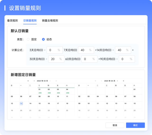 此外,针对当前时间中止补货,产品还是无法及时送到FBA仓的状况,领星ERP支持亚马逊卖家开启“倡议量扣除必断货量”的选项,保障补货的有效性。 2)灵活设置销量规则 在产品销量的预测上,亚马逊卖家只需在领星ERP设置不同时段的日均销量权重占比。领星ERP会自动分离产品近90天的历史销量状况,计算产品的预测销量。 亚马逊卖家也能够依据业务实践状况手动设置固定销量,以此预测未来销量。
