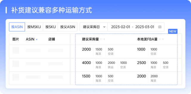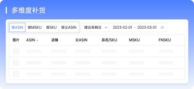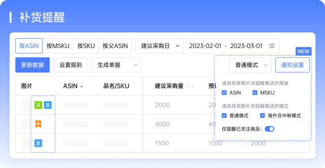 多维度/多方式计算,开启智能化补货领星ERP兼容亚马逊多种补货场景、支持多维度补货,亚马逊卖家能够按需选择,展开补货。 1)按需选择补货维度 领星ERP支持按ASIN、MSKU、SKU、父ASIN维度补货,亚马逊卖家能够依据所销售的产品状况选择相应的维度。