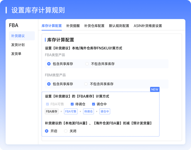 此外,亚马逊卖家可在领星ERP系统内设置扫除历史异常销量状况、断货销量数据状况等,好比旺季销量急剧增加、促销招致销量暴增的状况等,让产品销量走势更趋于实践,补货结果也更精准。 3)按需配置库存量统计公式 库存量同样是补货倡议需归入思索的关键要素。在库存量的统计上,亚马逊卖家可依据实践状况在领星ERP系统选择FBA在途的计算公式、能否包含共享库存、FBA库存的计算方式等。