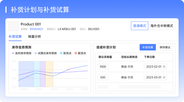 2)补货试算发现更优补货计划 亚马逊卖家能够借助「补货试算」工具,比较不同补货计划的效果,或者自定义添加货物的采购以及发货时间、数量等中止试算。 领星ERP会自动模仿补货后的库存走势,亚马逊卖家可明晰了解采用该补货计划之后的到货时间点、未来断货时间点等补货效果。 在分明该补货计划的效果之后,亚马逊卖家能够直接按该计划一键生成采购计划、采购单、海外备货单、发货计划等,操作方便。 3)多物流组合引荐补货更省成本 领星ERP内置了海派、海卡、空派、快递、铁运、卡航、传统联运等7种运输方式,亚马逊卖家能够组合选择多种运输方式中止补货。