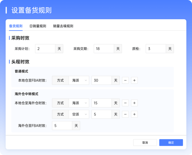 精密设置补货规则,自动提供补货倡议在选择补货维度与方式之后,亚马逊卖家需针对不同的产品状况设置相应的补货规则,以便领星ERP自动提供更精准的补货倡议。 在补货规则上,领星ERP将亚马逊卖家补货所需思索的各个要素都中止了预设,供卖家按需配置。 1)全面设置备货规则 在备货规则上,领星ERP已提早预设采购时效、头程时效、采购频率等要素,亚马逊卖家只需填写分明相应的天数即可。