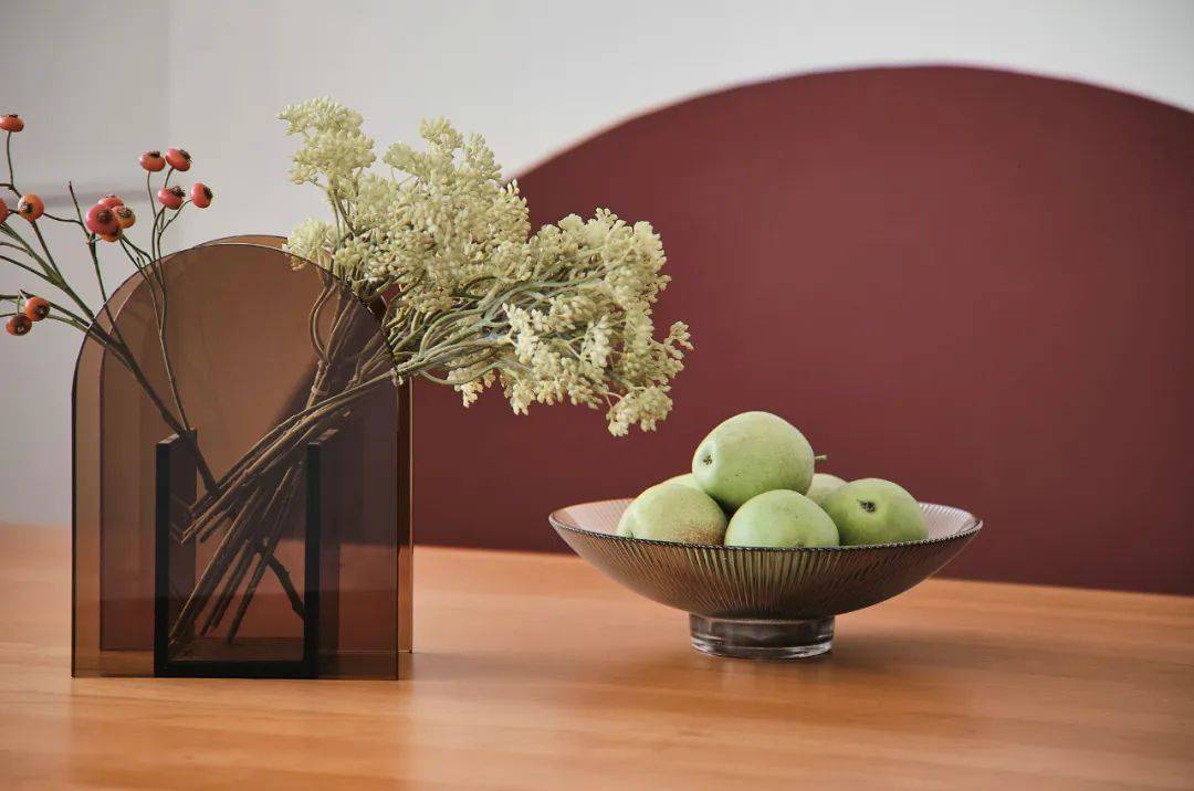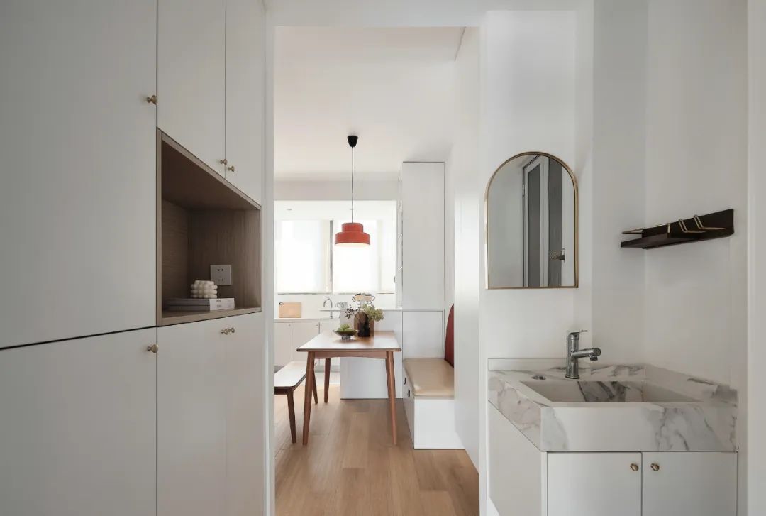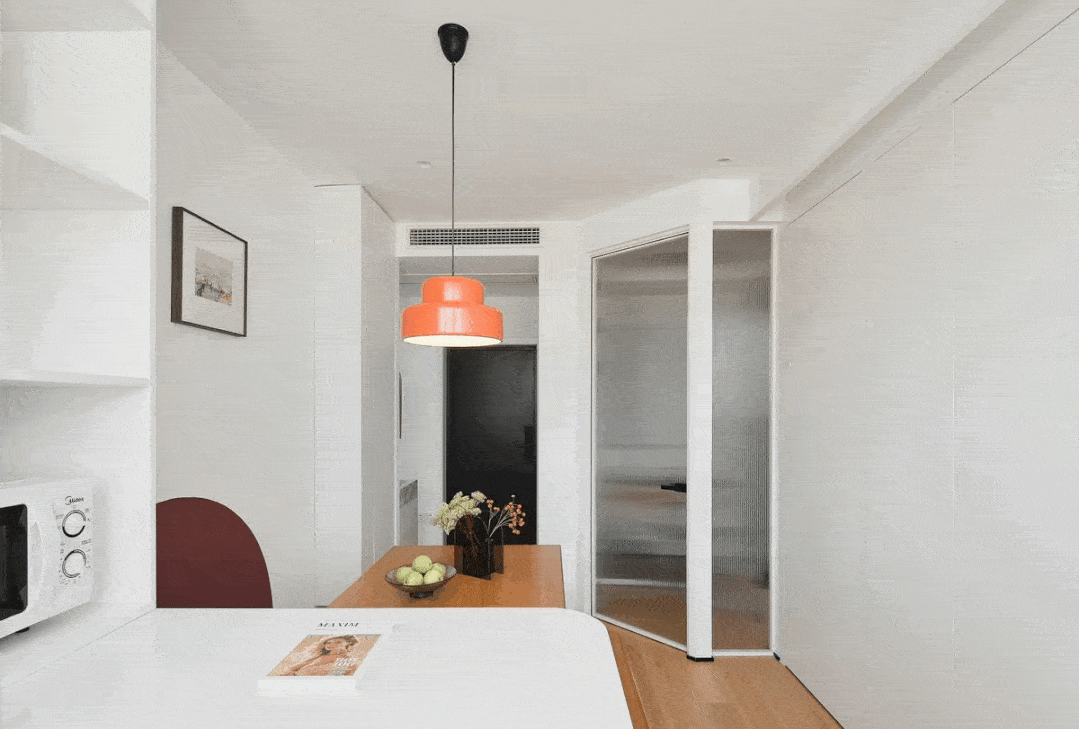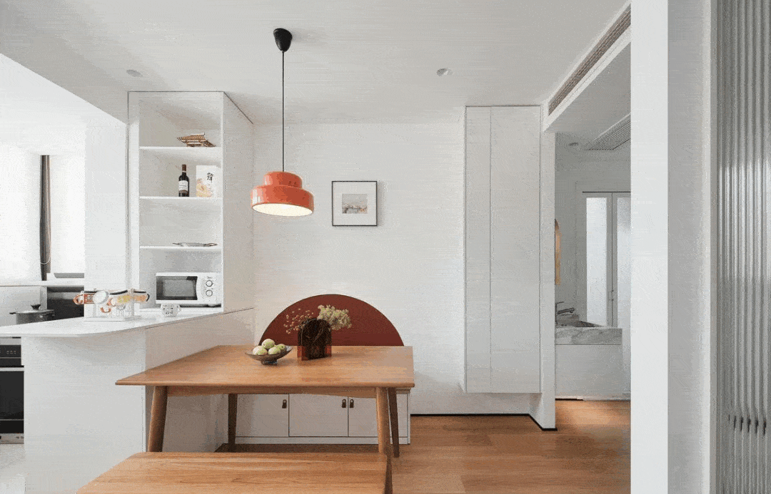 从入户看向客餐厅,由于位置小,客餐厅功用一体化设计,依据家人需求变换不同场景。