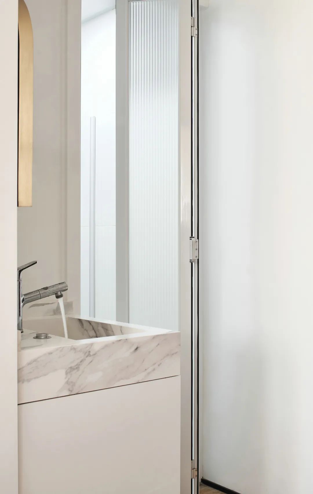 进门右手边是一个迷你的干区台盆,方便进门洗手,圆拱形小镜子,小挂钩上墙,固然很小的角落,却能满足生活的多种需求。 客厅