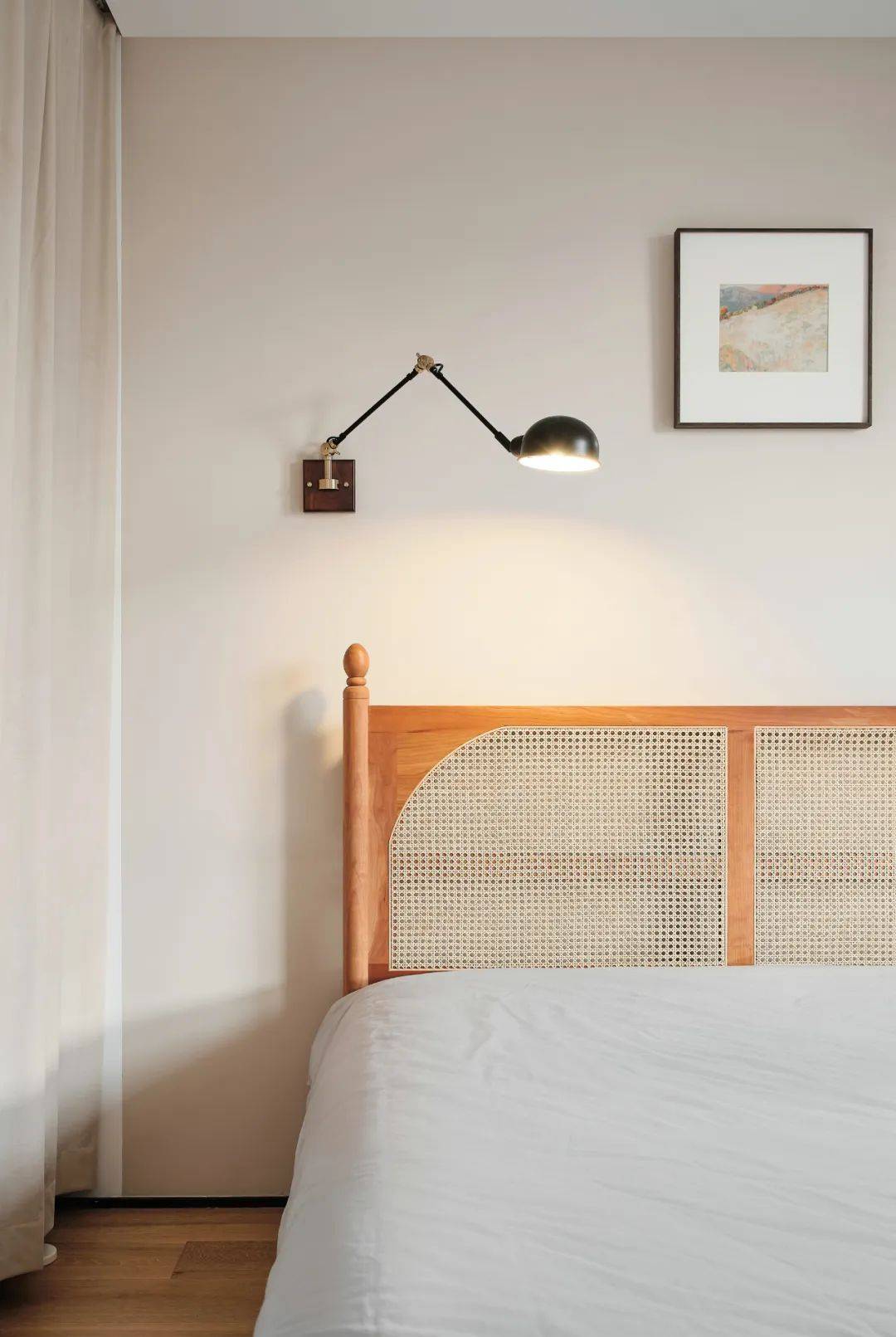 床头一盏长臂壁灯,满足睡前阅读照明需求,一幅装饰画装点床头,丰厚空间元素。