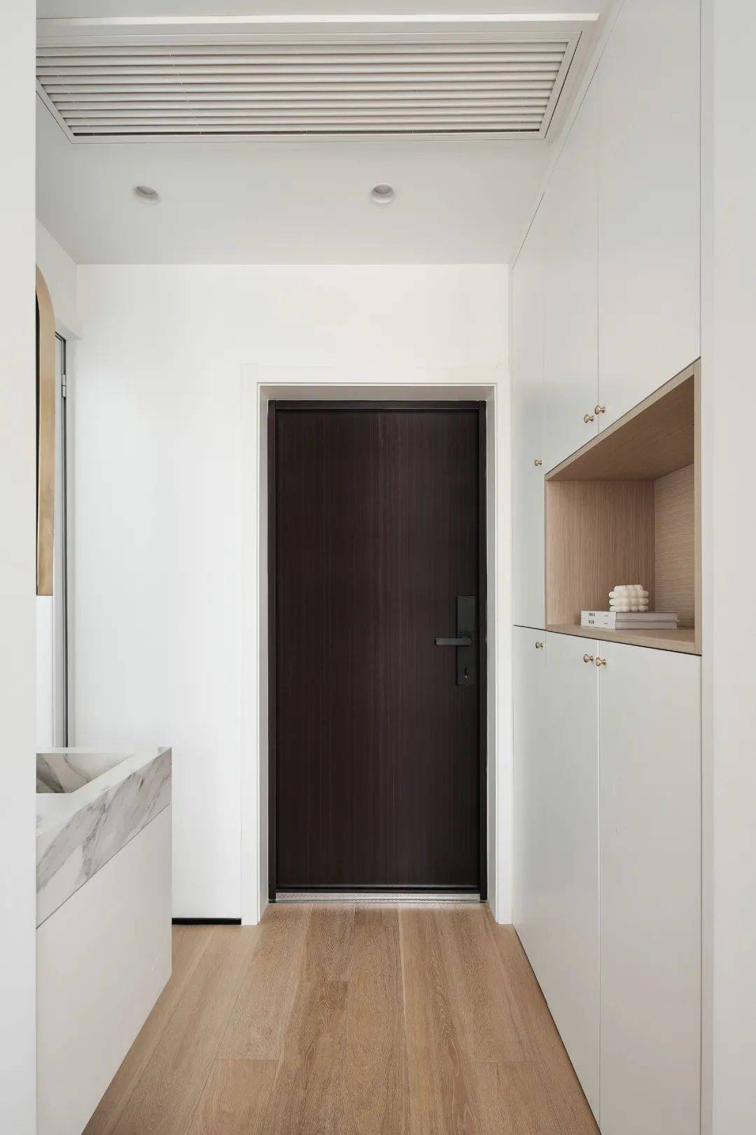 入户顶天立地鞋柜,木白组合,简约明亮温馨,开放式的位置方便一家人出入家门随手放置钥匙口罩等小物。
