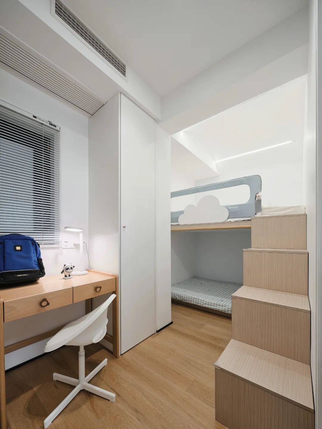 儿童房现场制造上下铺儿童床,尺寸与空间贴合充沛应用空间,上面小孩子休息,下面满足爷爷奶奶在这里休息,通往上铺的楼梯也设计了储物功用。 卫生间