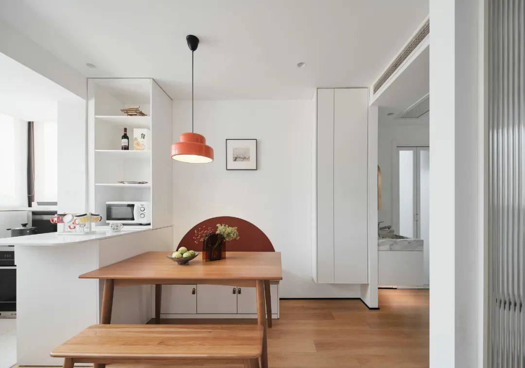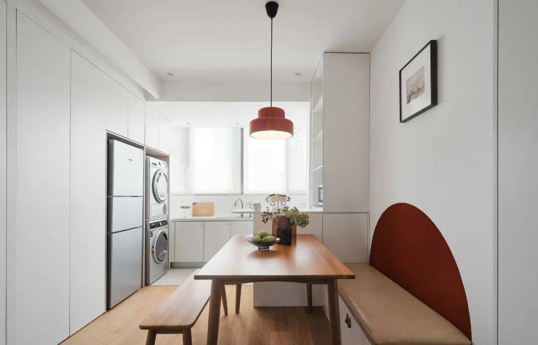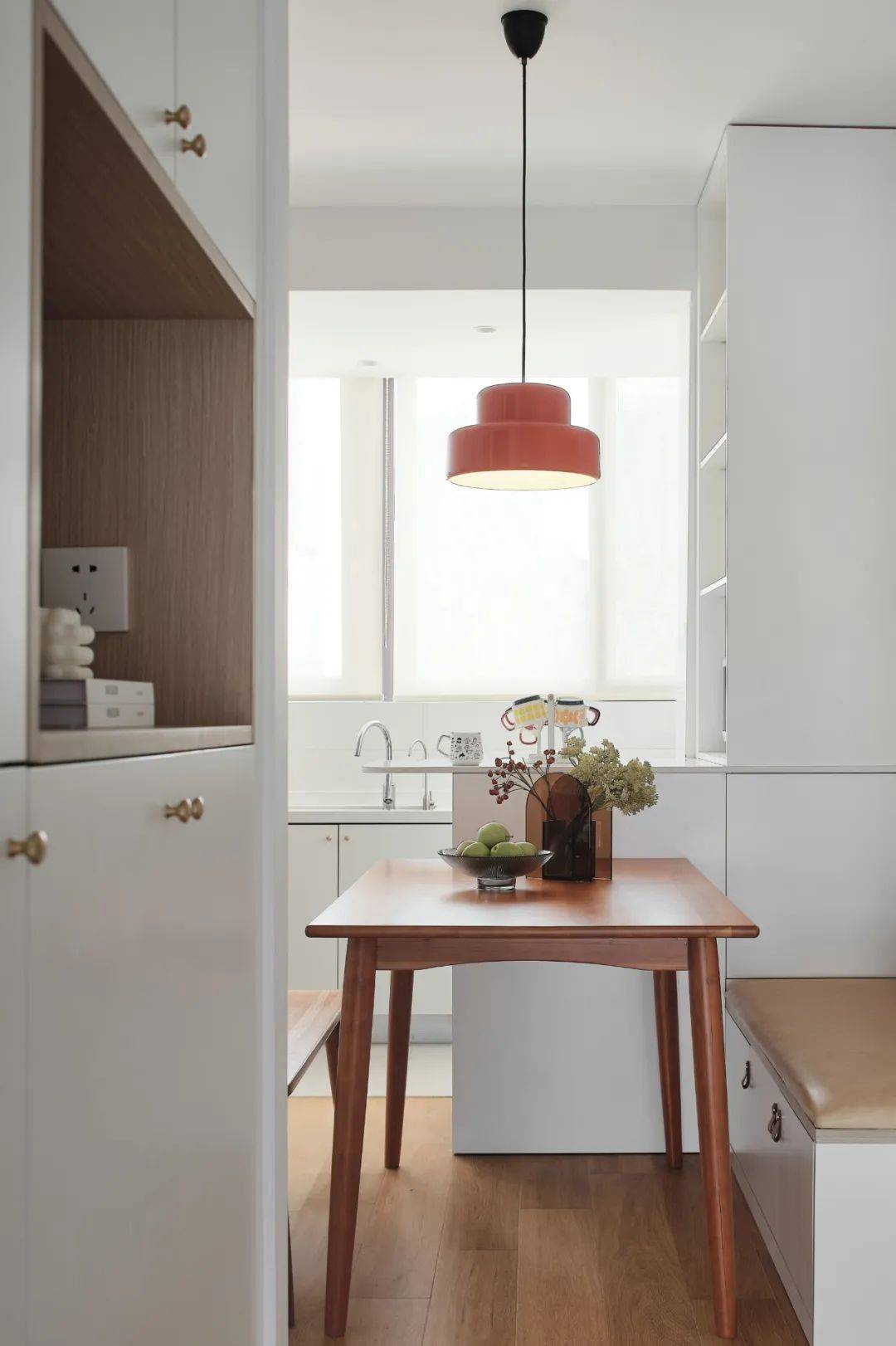 由于空间不大,为了便于一家人用餐,靠墙设计了一排卡座弥补餐椅功用,卡座还能够作为收纳空间。