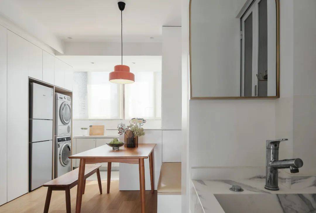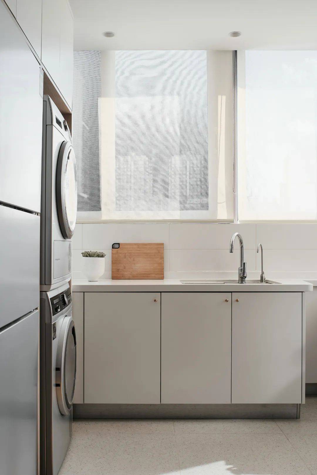 冰箱、洗衣机、烘干机嵌入餐边柜体里,增强空间的整体感,与此同时这面柜子也是家里物品的重要的收纳区。