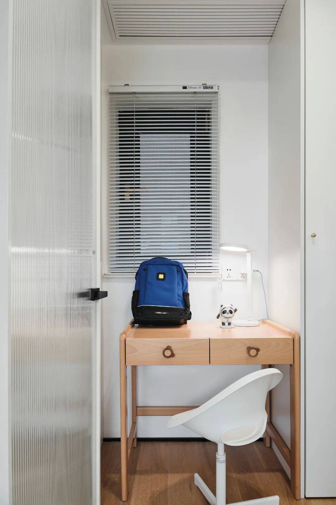 儿童房临窗摆放一张小书桌,小孩子在这里阅读写作业。