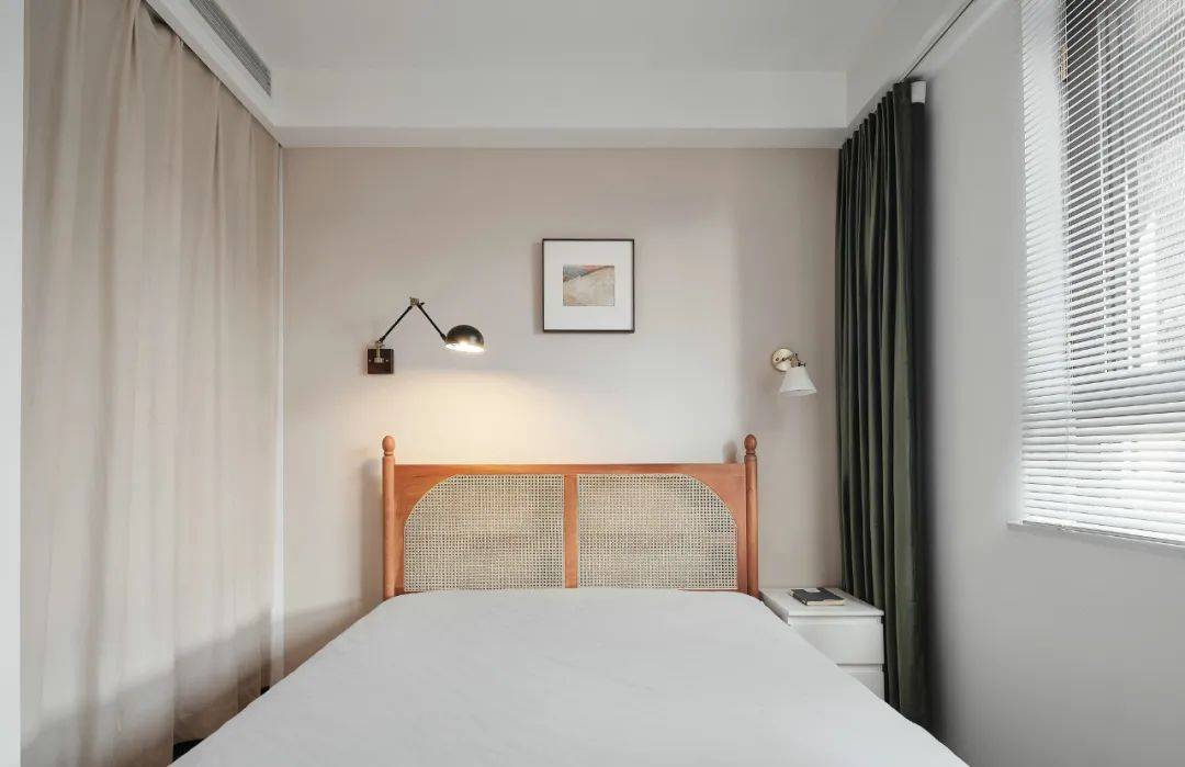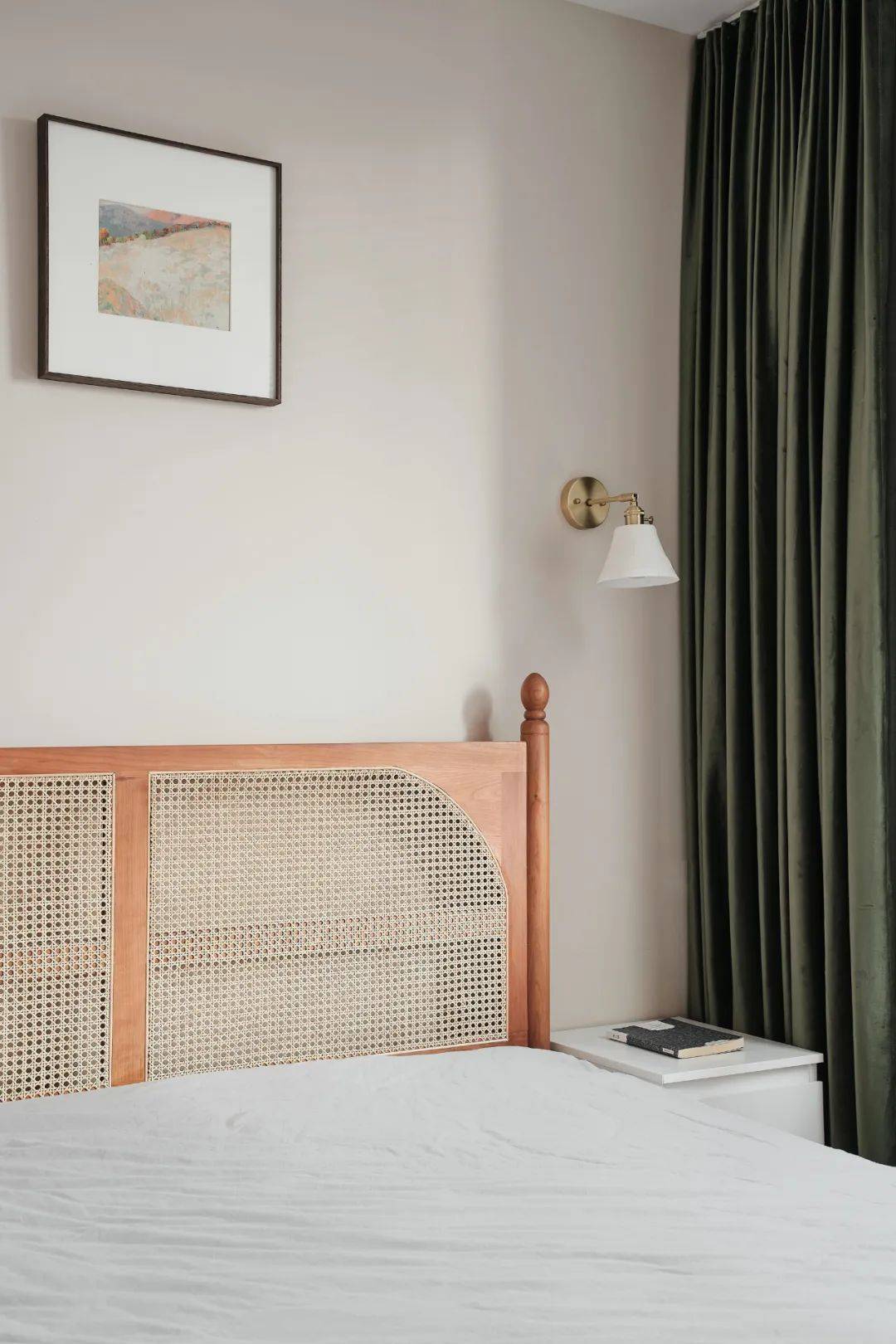 藤编床头背,金属壁灯,草绿色窗帘,营造复古氛围。#卧室#窗帘#壁灯 儿童房