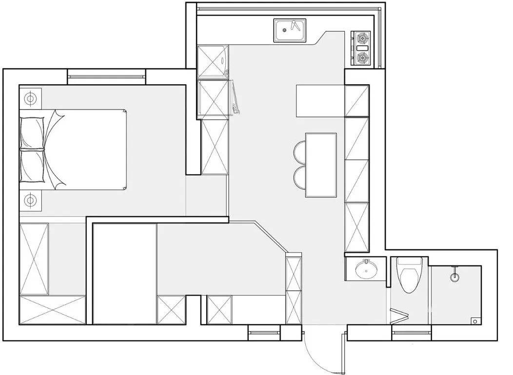 ▲ 平面规划图 设计战略: 1. 入户厨房移到阳台,制造一面顶天立地收纳鞋柜,让小户型也能具有一个储物功用的玄关柜。 2. 原先拥堵的卫生间改构成干湿分别,固然空间小但是划分出干湿分别,运用更方便。 3. 原来入户厨房的位置,再借一部分主卧的位置,化零为整变出一间功用丰厚的儿童房。 4. 阳台改构成厨房与客餐厅一体化设计,让小空间也功用齐全。 5. 主卧藏一间迷你衣帽间,让衣物也有序摆放。 玄关
