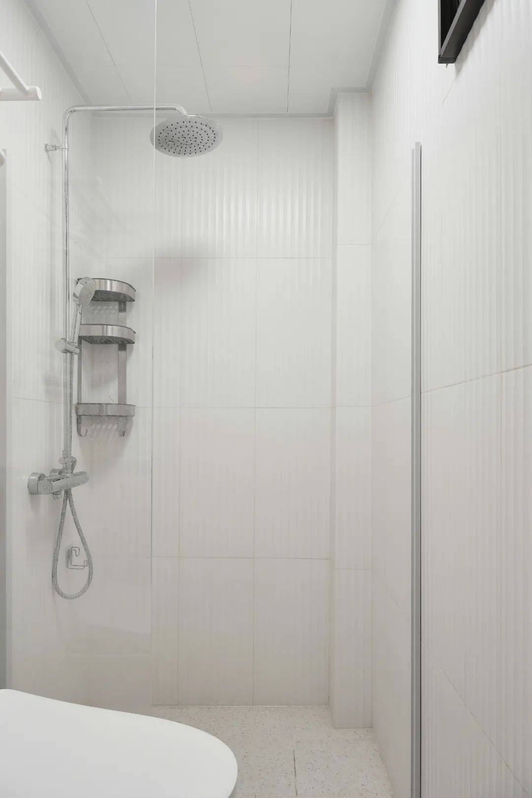 原来不大的卫生间改构成干湿分别,让小空间功用得到优化,图中我们看到卫生间的长虹玻璃门,尺寸在60cm左右。