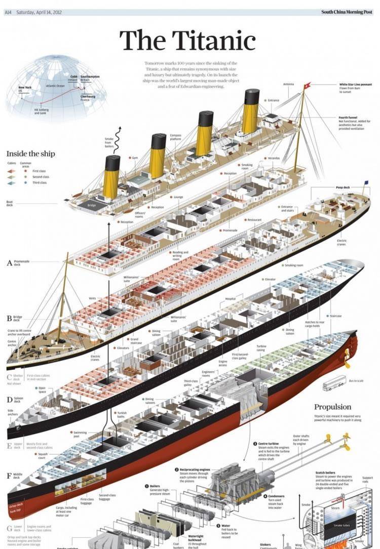 泰坦尼克号的面包师比格斯回想说:“……再不会有像她那样的船了。我曾经在奥林匹克号、庄严号、伊丽莎白王后号……上工作过。它们都比不上泰坦尼克号。……不错,就像奥林匹克号一样,不外要奢华得多。好比大餐厅,泰坦尼克号的地毯则厚得能够没过膝盖(太夸大了),然后就是家具,重得你都抬不动。还有那些护墙板……他们能够建造一艘更大、更快的船,可是泰坦尼克号却把全部力气放在修建一个奢华与温馨的空间上。她的确是一艘了不起的船!比格斯说出来的是一种普遍的见地。 在泰坦尼克号船体建造的两年中,传媒多次将该船的雄伟水平广为宣传,这实践上使泰坦尼克号在下水远航前就成了当代传奇。泰坦尼克号可谓当时世界上最奢华温馨的“梦境邮轮”。泰坦尼克号使得一切建造与设计她的人都遭到诱惑,这种诱惑力之大,使她在多年之后,越来越喜闻乐见。用《造船专家》杂志的话说,泰坦尼克号“在许多细节方面模仿了凡尔赛宫……摆满路易十五作风家具的休息室,作风相似法国的小特里亚农宫沙龙,壁炉上的雕琢作品是《凡尔赛宫的狩猎女神》。还有其它精巧的浮雕和艺术作品……上等的柚木和黄铜装饰,吊灯和壁画,印度和波斯的地毯”。 泰坦尼克号真实历史照片 由于泰坦尼克号是首航,很多人携带了相机拍摄了巨轮的照片,可是绝大部分的相片都随着巨轮永远沉入的大西洋,所以泰坦尼克号内部存世的照片十分少,网络上常见的被称之为泰坦尼克号螺旋桨、旋转大楼梯、室内游泳池的照片其实都是奥林匹克号的——这俩姊妹真实是太像了。 但是有个叫弗朗西斯·布朗(Francis Browne)的神父搭乘泰坦尼克号旅游,作为一名满怀热情的业余摄影师他一路拍摄,从英国的南安普敦市拍到昆士敦时,牧师的行为遭到了教区当局的明白反对,不得已布朗牧师只能下船分开了泰坦尼克号。没想到这因而挽回了他的生命,布朗终身都对“泰坦尼克”号念念不忘。也因而给世人留下了这组泰坦尼克号无独有偶的存世照片【让历史添加颜色 把1912年的泰坦尼克号换彩装】。但假如没有弗朗西斯·布朗神父这些存世的照片,我们对泰坦尼克号就不会有如此明晰的了解。这些照片还曾经被当作电影《泰坦尼克号》场景设计的参考素材,其中包含船上各种生活细节,如充沛应用的健身房、游玩的孩子、甲板上往来移动的乘客以及庞大的船体自身等。 泰坦尼克号的尺寸 泰坦尼克号全长269.06米(882.75英呎),宽28.19米(92.5英呎),规范排水量为46,328吨,吃水线到甲板的高度为18.3米(60英呎),动力50000匹马力(37MW),航速每小时23~24浬。动力装置包含两台往复式四缸三胀倒缸蒸汽机以及一台低压蒸汽轮机,驱动三个螺旋桨。这一混合发起机的运用代表了造船业的新技术。【当今世界最大的邮轮海洋绿洲号是泰坦尼克号5倍】 船上的25五台双端以及四台单端锅炉的动力来自159台煤炭熔炉(每天吞噬600吨煤),强大的动力使泰坦尼克号的最大速度抵达23节(43千米/小时)。四个19米(63英尺)高的烟囱中只需前3个用来排烟,剩下的一个属于陪衬,独一的实践用处是作为主厨房的烟囱。泰坦尼克号总共可搭载3547名乘客和船员,由于她也运送邮件,船名加上了“皇家邮轮”(Royal Mail Steamship,RMS)的前缀。 泰坦尼克号被以为是航海技术史上的一个里程碑,是一个技术成就的定点作品。泰坦尼克号速度并非是亮点,除了奢华外,更津津乐道的是保险性。 良好的防水措施使泰坦尼克号恣意两个隔舱灌满了水,她依旧能够行驶,以至四个隔舱灌满了水,也能够坚持漂浮状态。当时的人们再也想象不出更糟糕的状况了,所以当时的《造船专家》(The Shipbuilder)杂志以为其“基本不可能漂浮("The ship is unsinkable.")”。泰坦尼克号飞行过程中,一位船员对二等舱女乘客西尔维亚·考德威尔(Silvia Caldwell)说:“就是上帝亲身来,他也弄不沉这艘船。”泰坦尼克号采用了双底结构,相当于有两层防水层,由带自动水密门的15道水密隔墙分为16个水密隔舱(Watertight Compartment),逾越全船,衔接各舱的水密门可经过电开关统一关闭。但是泰坦尼克号防水壁并没有穿过整个甲板,头两道水密隔墙与最后的五道,只建到了D甲板。中间的八道墙则只设到了低一层的E甲板。更遗憾的是当晚有五个水密舱进水。