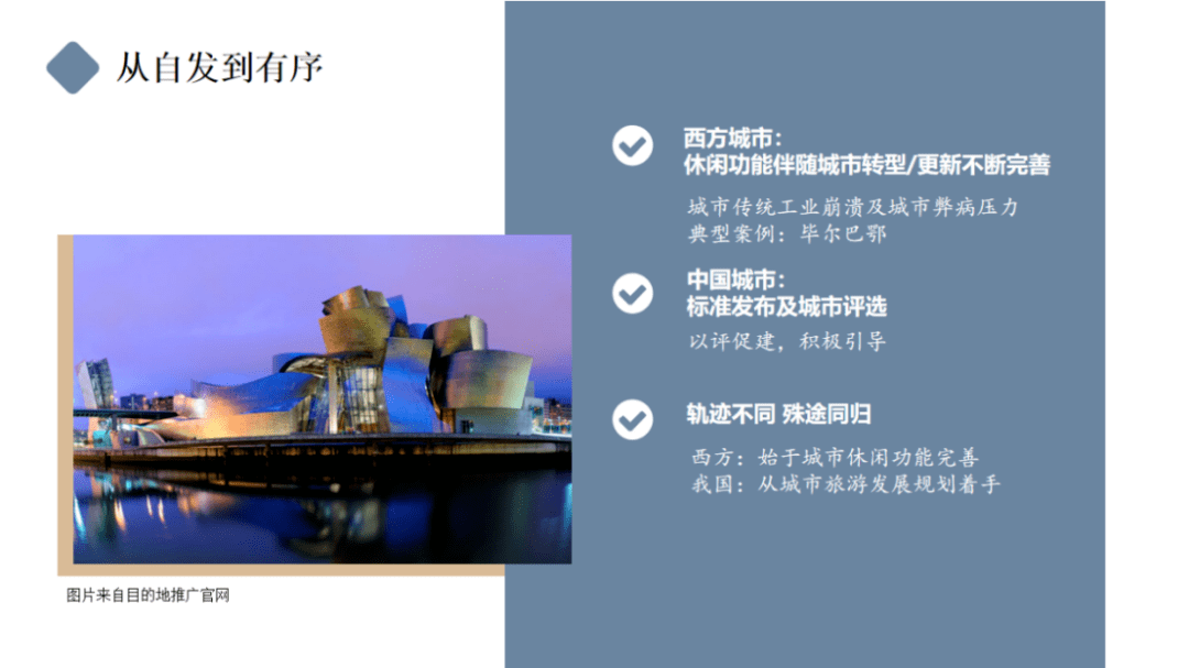 西方工业国度大约在20 世纪70 年代以后逐步完成工业化,很多城市面临原有传统工业衰落,环境污染、交通拥堵等城市弊病的压力而亟需转型。这些城市开端有规划地展开城市改造,完善城市休闲空间和设备,经过文化复兴和休闲功用展开,完成城市复兴和转型。这些工作客观上极大地提升了城市的休闲和旅游质量。能够说,城市休闲功用是随着城市转型、更新而不时完善的。 毕尔巴鄂的案例十分典型,为应对传统工业解体和城市的种种弊病 ,大约从20世纪90年代年开端,毕尔巴鄂实施了以文化、贸易及旅游展开为主导的综合性城市复兴计划。经过修建古根海姆博物馆等文化休闲设备和公共设备,改善交通,引入学问创新型产业等措施,毕尔巴鄂最终完成了城市复兴。 我国在1995年开端实行双休日工作制,在1999年开端实施“十一”黄金周。随同社会经济快速展开,人民的收入不时增加,旅游业开端步入大众旅游时期。原国度旅游局从城市旅游展开的现状动身,经过规范发布及城市评选活动,以评促建,积极引导城市不时完善旅游和休闲基础设备,提升旅游和休闲效劳质量。从 1998 年的《中国优秀旅游城市检查规范(试行)》以及“中国优秀旅游城市”创建,到2003 年的《中国最佳旅游城市规范体系》及“中国最佳旅游城市”创建,再到2015 年的《旅游休闲示范城市》行业规范以及“旅游休闲城市”创建。这些规范和城市评选活动为促进我国城市旅游休闲展开发挥了重要作用。 对比来看,我国与西方城市的旅游休闲展开轨迹不同。西方城市是在工业化后的城市转型以及居民请求改善社区环境的压力下,开端规划、完善城市的休闲功用,同时效劳外来游客。我国城市则是从旅游展开规划着手,逐步过渡到城市旅游和休闲展开,以完成主客共享。道路不一,又殊途同归,城市旅游休闲展开最终都是为了满足人们对美好生活的需求。 二、城市旅游休闲展开背地文化的力气 城市范围不同,其旅游休闲展开方式和途径也有所不同。思索到城市的地域散布、依托的基础资源类型及典型性等,课题组选取巴塞罗那、奥兰多和悉尼作为大中型城市代表,坎昆、里米尼和乌布作为小城镇代表。