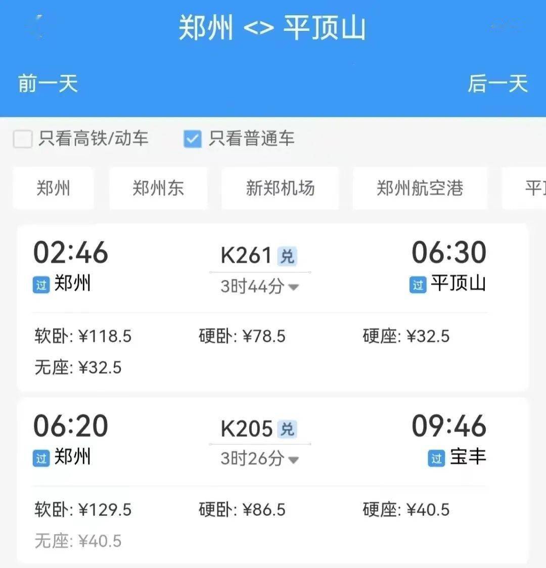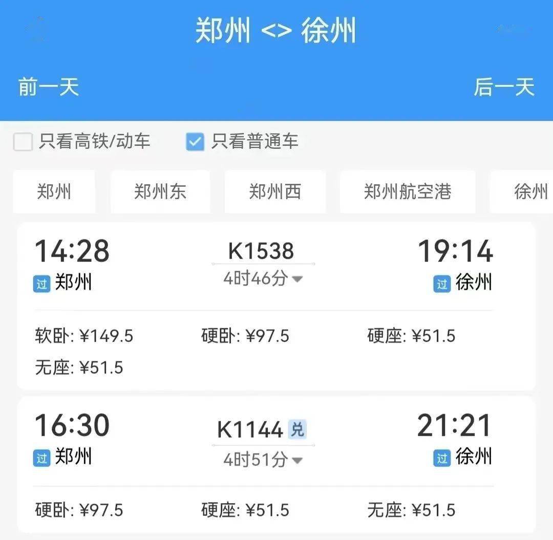 图源:铁路12306APP # 出游攻略 # 引荐景点:尧山-中原大佛、平顶山博物馆、二郎山、灯台架…… 引荐美食:郏县饸饹面、酱焖鸡、羊肉冲汤...... 郑州徐州 徐州是两汉文化的发源地,因其具有大量文化遗产、名胜古迹和深沉的历史底蕴,也被称作“东方雅典”。徐州距离郑州十分近,喜欢汉文化的小同伴能够来这里游玩。 火车硬座票价:51.5元