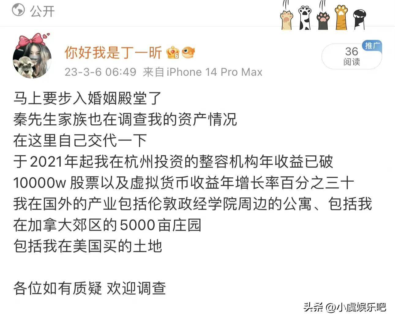 丁一昕写到: “马上要步入婚姻殿堂了, 秦奋先生家族也在调查我的资产状况, 我在2021年起在杭州投资的整容机构年收益已破10000万(一亿), 股票以及虚拟货币收益年增长率百分之三十, 我在国外的产业包含伦敦政经学院周边的公寓, 包含我在加拿大郊区的5000亩庄园, 包含我在美国买的土地。”