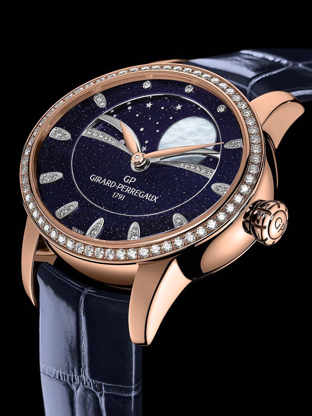 GP芝柏表猫眼系列“星光夜空月相”腕表珍珠母贝表盘 GP芝柏表猫眼系列“星光夜空月相”腕表配备珍珠母贝表盘和砂金石表盘,共有两款可供选择。GP芝柏表猫眼系列“星光夜空月相”腕表以62颗明亮式切割钻石装饰玫瑰金表壳,猫眼系列标记性椭圆形表壳为熠熠星空打造华美舞台。珍珠贝母表盘以玑镂雕琢装饰,与深蓝星空中翩翩起舞的月亮浪漫辉映。水滴状的钻石刻度将光线聚焦在59天内完成旋转的月相显现圆盘,令腕表整体分发出如月光般明朗皎洁的光辉。砂金石表盘的表款颇具神秘魅力,GP芝柏表特别选用的砂金石如繁星般闪闪发光,深蓝色更显夜的静谧深邃,烘托腕中月亮愈加鲜明耀眼,营造出如梦似幻的星空月夜。
