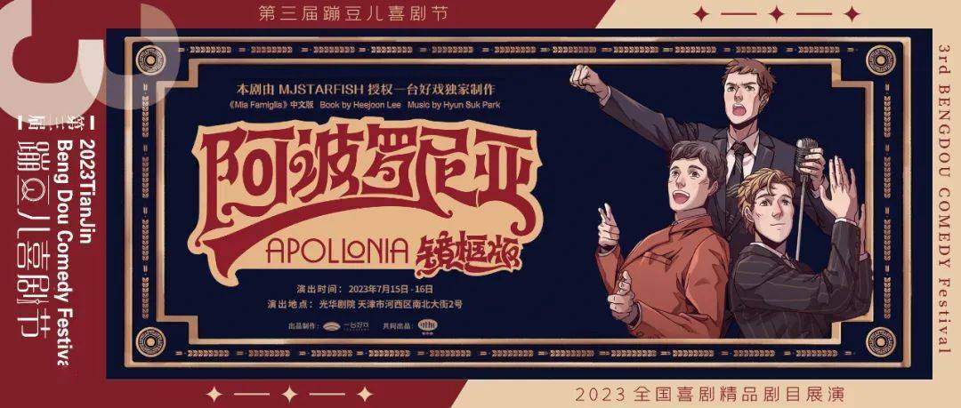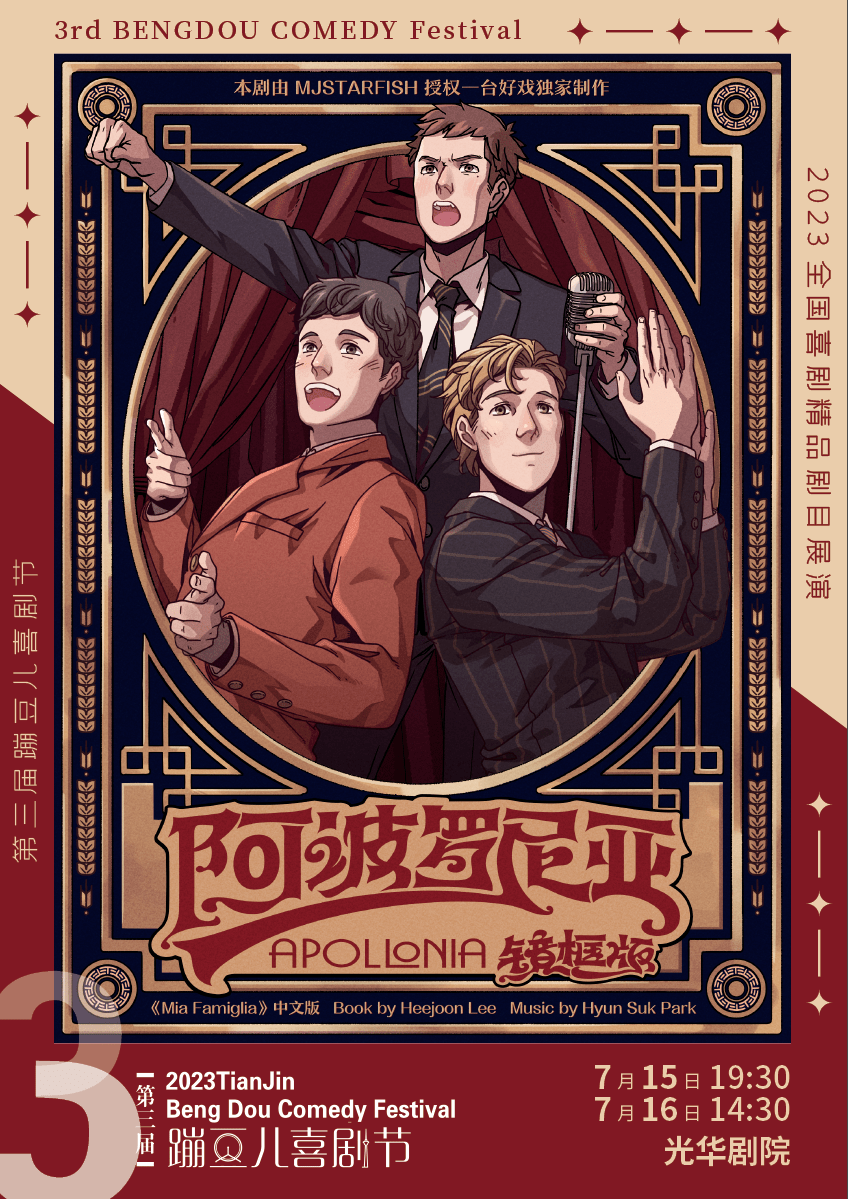一台好戏签约演员 中国传媒大学 音乐剧专业 主要作品:环境式驻演音乐剧《阿波罗尼亚》、音乐剧《阿波罗尼亚》镜框版、《桑塔露琪亚》镜框版等。 三个男人,一台好戏 高潮迭起,笑料百出 为你讲述一个关于爱、友谊、信仰 与据守的故事 音乐剧《阿波罗尼亚》镜框版 Mia Famiglia中文巡演版 2023年7月15日、16日 登陆天津光华剧院 一同坠入爱的世界