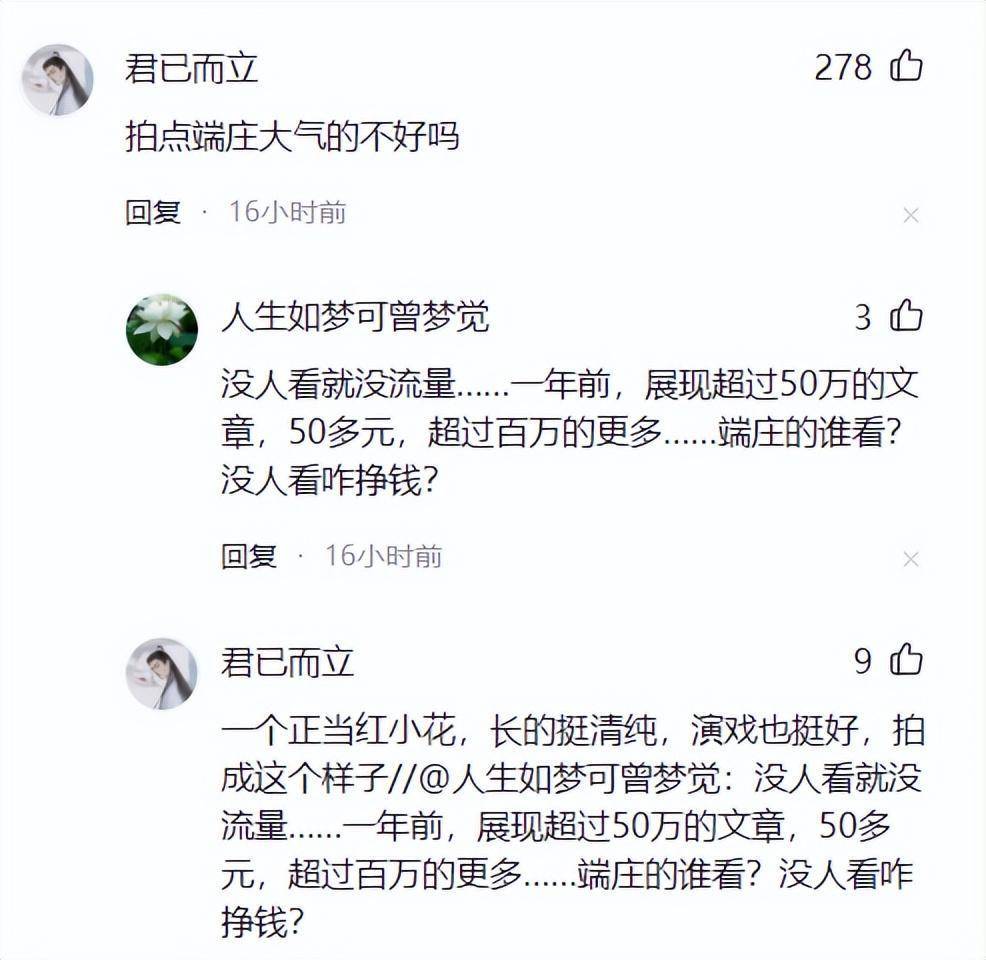 这个故事十分正面,但是李艺彤的照片呢?似乎只是在摆姿势,卖弄性感! 因而,李艺彤和她的团队应该深思一下。拍性感的照片没有错,但是一定要留意尺度! |
