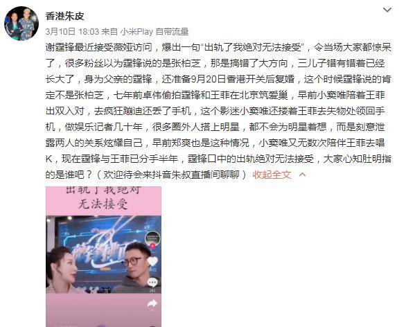 据朱皮所说,前段时间谢霆锋现身在薇娅直播间,两人在直播间里谈了很多话题,当薇娅问其谢霆锋感情问题时,说他最无法接受什么?谢霆锋通知薇娅自己无法接受出轨,很多人以为当时的谢霆锋说的正是张柏芝,由于之前张柏芝和谢霆锋分手就是由于女方出轨。可是朱皮以为他在那时说的出轨对象则是王菲,那时两人的关系也早已决裂。