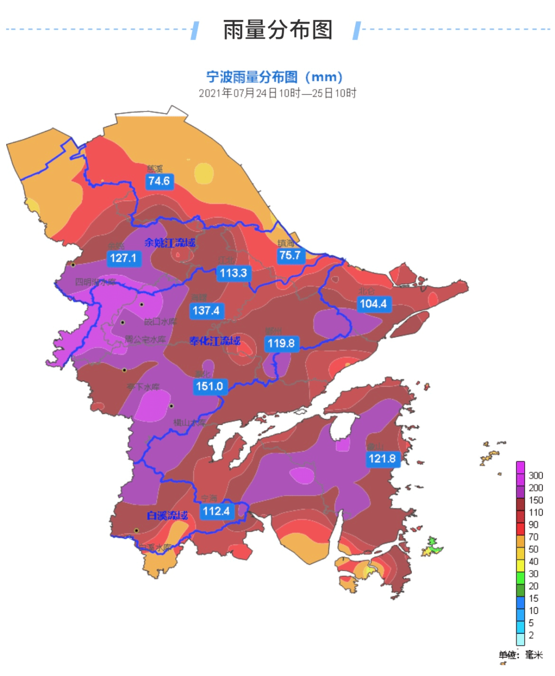 台风位置通报:“烟花”(台风级)11时位于宁波偏东方向110公里的海面上,北纬29.9度,东经122.7度,13级(38米/秒),965百帕,时速15公里,移向西北。 实况通报 24日10时至25日10时宁波全市面雨量115.6毫米,各县(市、区):奉化151.0毫米、海曙137.4毫米、余姚127.1毫米、象山121.8毫米、鄞州119.8毫米、江北113.3毫米、宁海112.4毫米、北仑104.4毫米、镇海75.7毫米、慈溪74.6毫米。单站最大为余姚丁家畈站294.4毫米。