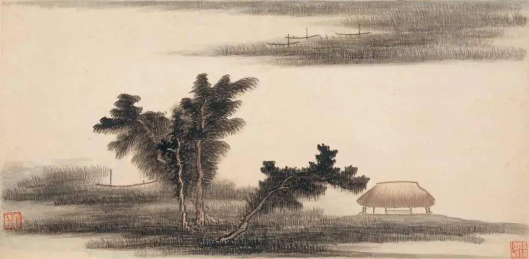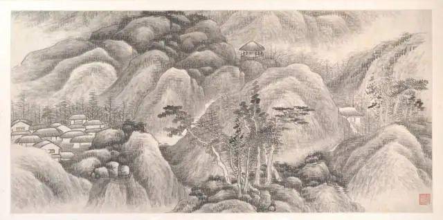 在“黑龚”阶段,他自创和吸收了米氏云山的积墨法,但并无放弃自己经构成的笔法特性。他将米氏法加以改造,归入自己的笔法规范,先干后湿,先皴后染,层层深化。试看其山水,先勾山、树轮廓,再以干笔皴之,构成灰调子,在复皴数遍,颜色渐趋深重,自具苍郁之感。而若用湿笔层层染之,效果亦可大致似乎,但其质感则自具差别。出于这样的思索,龚贤运用出具有差别的积墨法,包含干积法,湿积法,干湿并用法等。