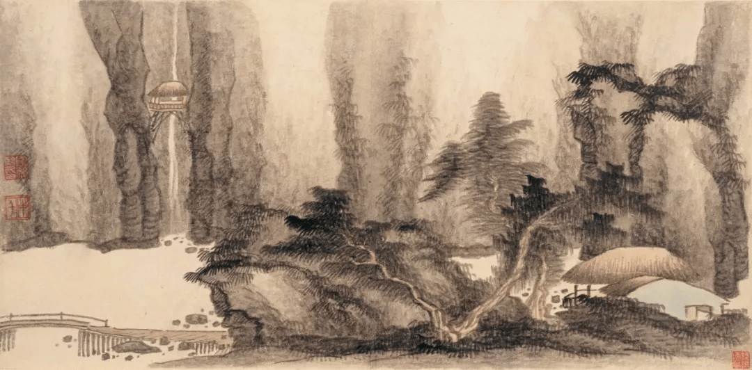 从元、宋以降,凡重墨法者,不是用墨去涂涂抹抹,而是把墨之“味”、墨之“趣”调合消融于画里。这种调合,取的是皴染之法。龚贤画山,其于勾皴之间,必用染。染在落笔前,能够在砚中调合,亦可在绢、纸上调合。墨颜色合极为不易,特别用的是松烟。一调一合,若不得法,便见“斧凿痕”。八大山人曾有诗曰:“浑无斧凿痕,不是惊鬼神。”意即是:凡作画,笔墨要自然,形象要生动,要无纵横造作之气,这就抵达了“无斧凿痕”的妙处。否则,虽染而实似涂鸦,便难使人悦目。