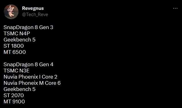 Oryon中心计划除了工艺上的提升之外,爆料表示高通骁龙8 Gen 4处置器会丢弃ARM的公版CPU中心设计,而是采用自家研发的Oryon中心计划,有2个Nuvia Phonenix性能核+6个Nuvia Phoenix M能效核,据称多核性能最高能够进步40%。 Nuvia其实是一家主攻CPU开发定制的公司,之前被高通收购用于开发高通自家的处置器。假如这个音讯属实,那ARM可能得有压力了,固然ARM架构在移动端产品上的确有着不少优势,但大厂们也是有才干自研的,而且从爆料出来的跑分状况来看,似乎高通这自研效果还不错。