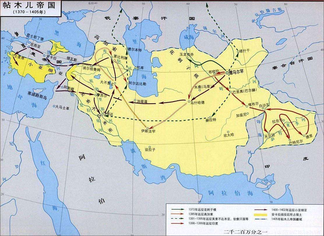 帖木儿帝国疆域图 帖木儿帝国 帖木儿帝国开国大帝帖木儿出生于西察合台汗国的撒马尔罕以南的渴石城左近的蒙古巴尔拉斯部区,这个部落在十四世纪来到卡什卡河流域寓居。他们的氏族固然还过着游牧生活,但是曾经部分地开端向定居过渡,帖木儿的妻子是西察合台汗国合赞汗的女儿,因而《明史》称帖木儿为元驸马。 洪武三年(1370年)到永乐三年(1405年)间帖木儿打败埃及马布留克王朝,占领叙利亚,打败奥斯曼土耳其帝国,活捉巴耶塞特苏丹,消灭印度德里苏丹国。开创了一个大帝国,以今天的乌兹别克为中心。在其鼎盛时期横亘从格鲁吉亚到印度的西亚、中亚和南亚。首都为撒马尔罕,后迁都到今阿富汗西部的赫拉特。永乐三年(1405年)帖木儿率兵东征明朝,途中病死,明朝与一次灾难擦肩而过。 帖木儿帝国文化得到庞大展开。这个时期被誉为“帖木儿文艺复兴”、“波斯文学艺术的黄金时期”。15世纪中叶,成吉思汗长子术赤的后嗣昔班在中亚草原兴起,弘治十三年(1500年)攻占布哈拉和撒马尔罕,树立乌兹别克汗国,正德元年(1506年)灭帖木儿帝国。帖木儿帝国的统治者们无法转而去印度开创莫卧儿王朝去了。 莫卧儿帝国 嘉靖五年(1526年),帖木儿的五世孙——巴布尔入侵印度,宣布为印度斯坦皇帝,标记着莫卧儿王朝统治印度的开端。之后,巴布尔又经过嘉靖六年(1527年)的坎努战役和嘉靖八年(1529年)的戈格拉战役,统一了北印度。嘉靖九年(1530年),胡马雍继位(1530年——1556年)。嘉靖十九年(1540年),胡马雍在曲女城战役中为比哈尔阿富汗酋长舍尔沙击败,逃亡波斯和阿富汗,莫卧儿王朝在印度的统治暂告中缀。嘉靖三十四年(1555年),胡马雍重征印度平原,占领德里和亚格拉,恢复了莫卧儿王朝在印度的统治。嘉靖三十五年(1556年),阿克巴继位,实行了进步的内政变革,采取宽容的宗教政策,扩展了莫卧儿王朝统治印度的社会、 政治基础。他树立中央集权制,开疆拓土,统一了次大陆宽广地域,推进了印度社会经济的向前展开。到查罕杰(1605年——1627年在位)和沙·贾汉(1628年——1658年在位) 时期,莫卧儿王朝国势日盛。文化艺术亦进入一个新的展开阶段。这一时期的艺术特性,是民族传统与中亚及波斯艺术相分离,举世出名的泰吉·玛哈尔陵,能够作其典型代表。 咸丰八年(1858年)莫卧儿王朝沦为英国殖民地. 希瓦汗国 十六世纪,成吉思汗长子术赤后嗣阿不海汗树立强大的乌兹别克汗国。位于阿姆河下游的花剌子模绿洲,统治范围西及里海,南达呼罗珊北部。固然统治阶级和贵族阶级是蒙古人,但主要居民为乌兹别克人,次为土库曼人、卡拉卡尔巴克人和哈萨克人。