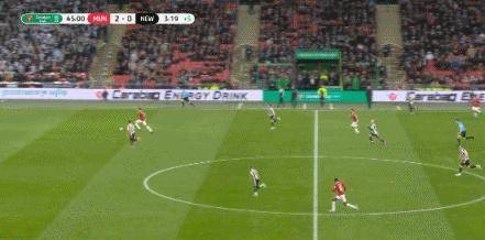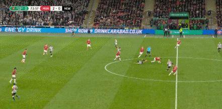 第39分钟,维尔霍斯特得球后带球前插,随后将球分给了插上的拉什福德,后者禁区内左脚抽射偏出。球击中了博特曼并被折射。卡里乌斯很无助。曼联2-0纽卡斯尔。