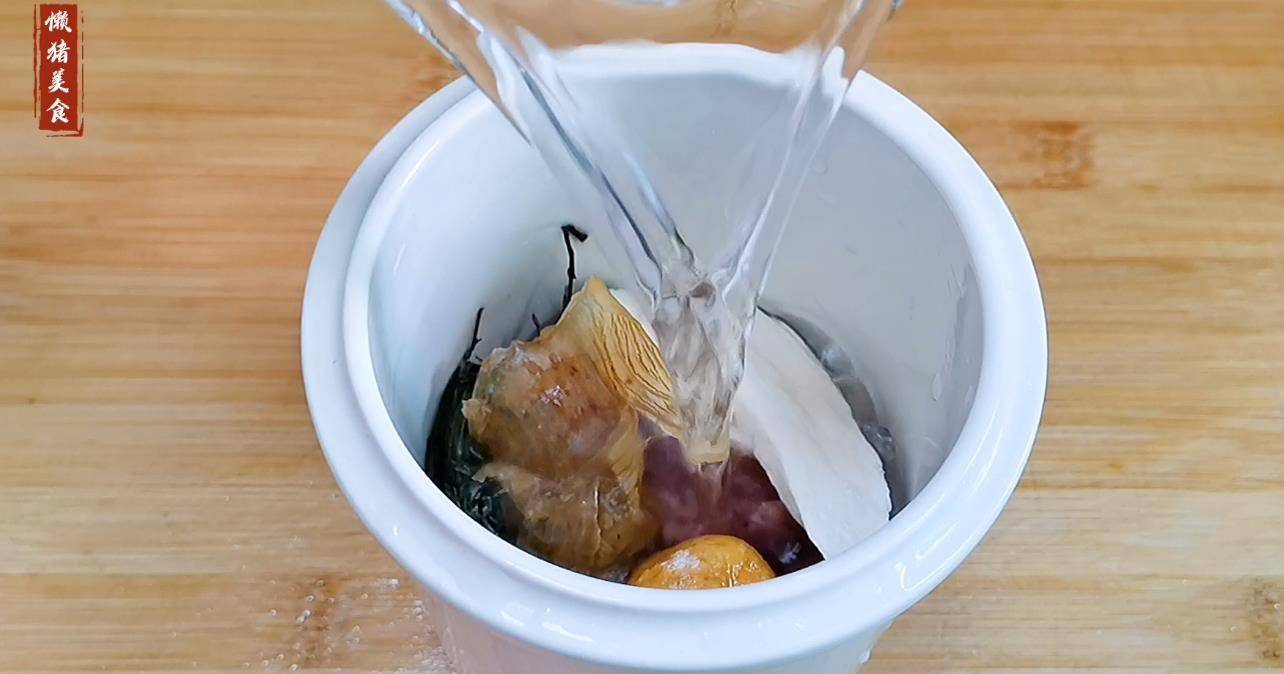 3.准备一个洁净的炖盅,将瘦肉,淮山片、鸡内金、蜜枣、独脚金,再加几片生姜一同放入炖盅中,参与清水,隔水炖2小时,最后加盐调味即可。
