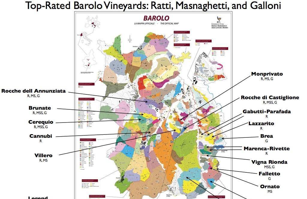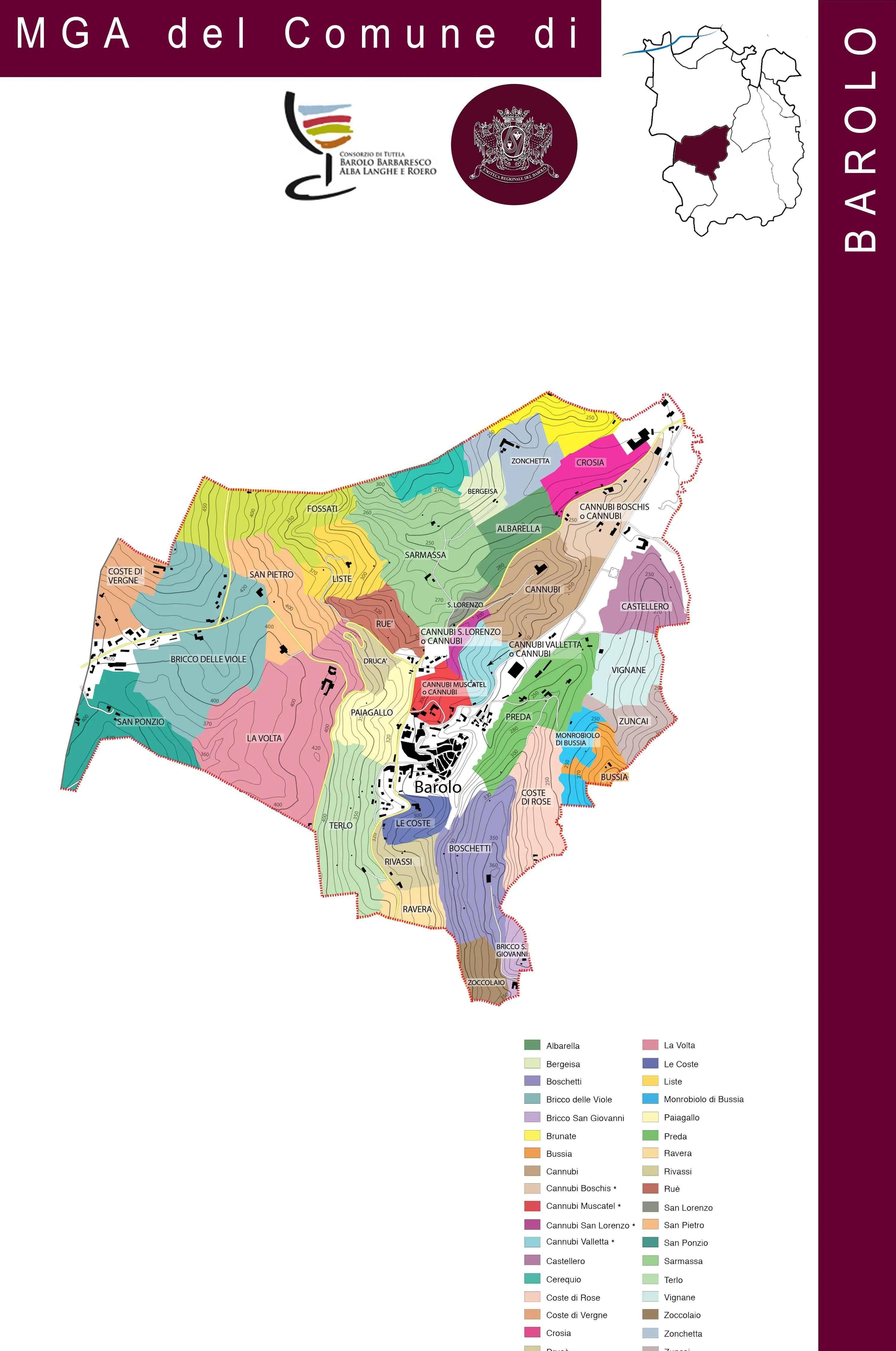 巴罗洛村特级园名录:Albarella, Bergeisa, Boschetti, Bricco delle Viole, Bricco San Giovanni, Brunate, Cannubi, Cannubi Boschis, Cannubi Muscatel, Cannubi San Lorenzo, Cannubi Valletta, Castellero, Cerequio, Coste di Rose, Coste di Vergne, Crosia Druca', Fossati, La Volta, Le Coste, Liste, Monrobiolo di Bussia, Paiagallo, Preda, Ravera, Rivassi, Rue', San Lorenzo, San Pietro, San Ponzio, Sarmassa, Terlo, Vignane, Zoccolaio, Zonchetta, Zuncai