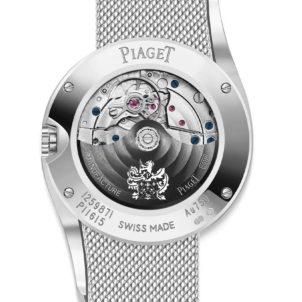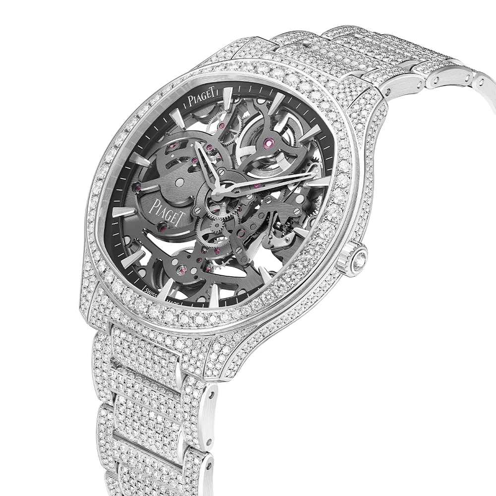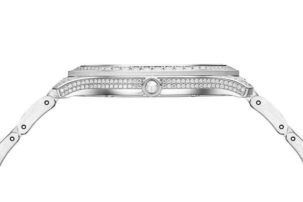Polo系列高级珠宝镂空腕表的表壳为18K白金材质,直径42毫米,厚度只需7.35毫米。本款腕表通体镶嵌了绚烂的钻石,表壳上有268颗(总重约2.43克拉)、18K白金表链上有1478颗(总重约10.04克拉),最后在表冠上也反向镶入一颗重量约为0.05克拉的钻石作为点睛之笔。整表的防水才干为30米水深,表扣为折叠扣。