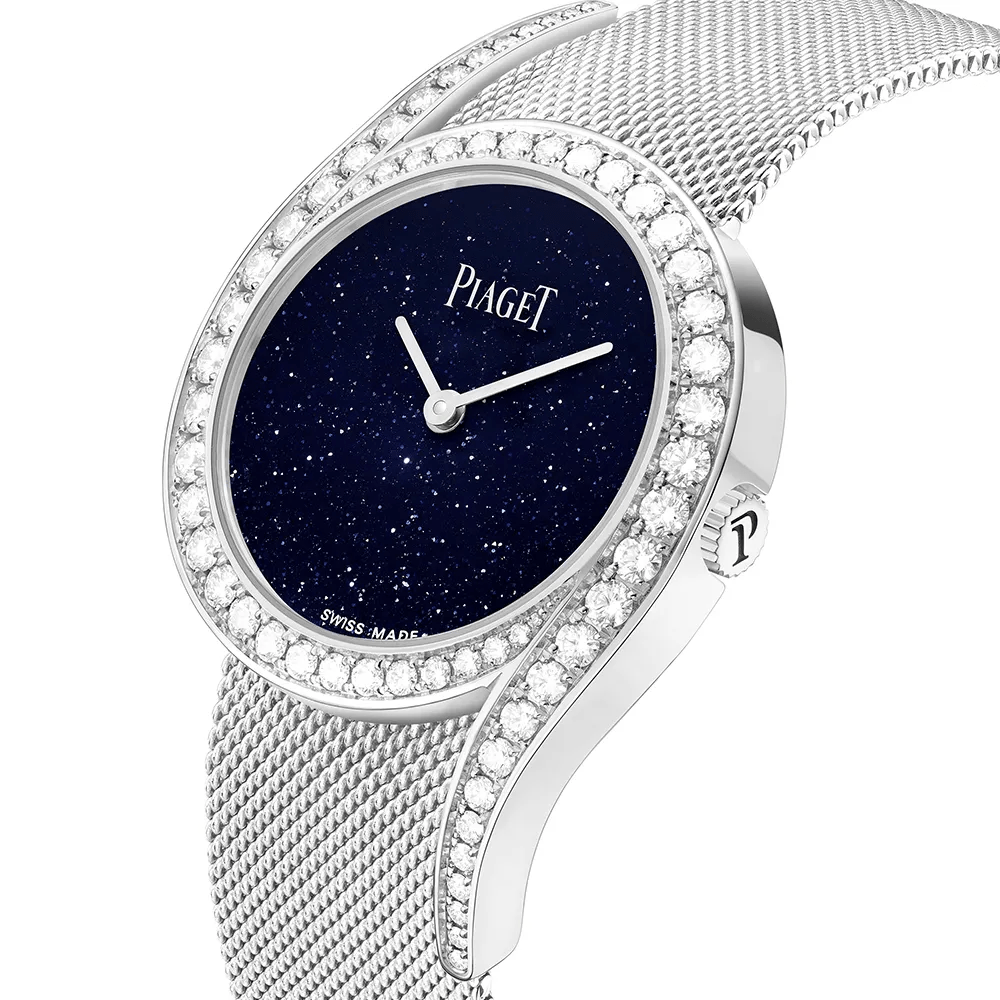 腕表采用了直径32毫米的18K白金表壳,镶嵌62颗钻石(总重约1.66克拉),不时延伸到表耳上。表盘为砂金石玻璃材质,盘面规划是简约的两针式设计。表链是和表壳同样材质的米兰网织链,由八位伯爵巨匠耗时100多个小时打造而成,搭配滑动式表扣。
