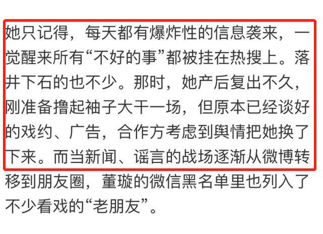 董璇在采访中透露:“我只记得,每天都有爆炸性的信息袭来,一醒悟来一切‘不好的事’都被挂在热搜上。乘人之危的也不少。”而那时的她正是产后复出不久,正打算撸起袖子大干一场,却因这场风云,原本谈好的资源全都被换人,以至还丧失了不少看戏的“老朋友”。